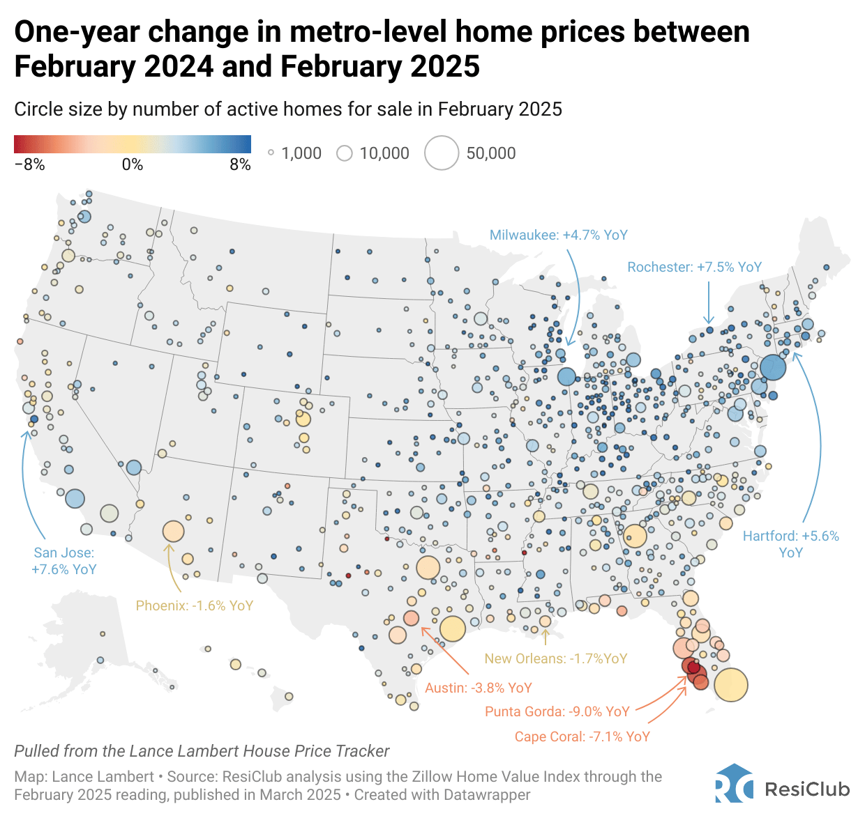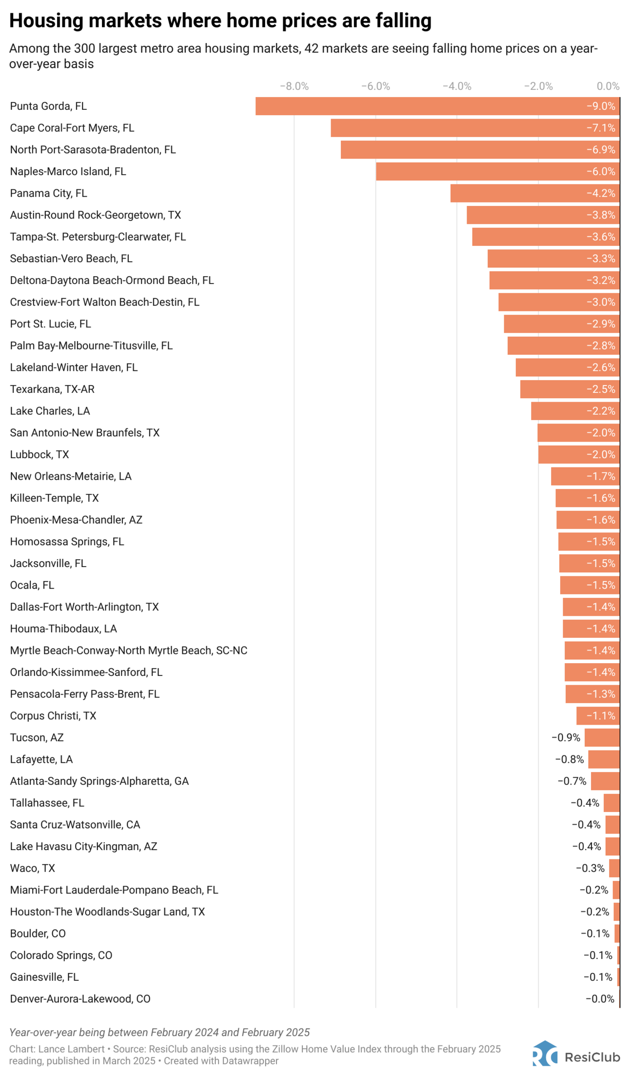 National home prices rose +2.1% year-over-year from February 2024 to February 2025, according to the Zillow Home Value Index. That’s a deceleration from the +4.6% year-over-year rate last spring. However, not every housing market is seeing rising home prices.