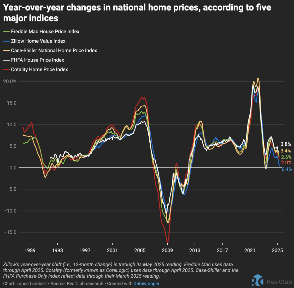 National home prices rose +0.5% year-over-year between May 2024 and May 2025, according to the Zillow Home Value Index reading published last week—a decelerated rate from the +3.9% year-over-year rate between May 2023 and May 2024.