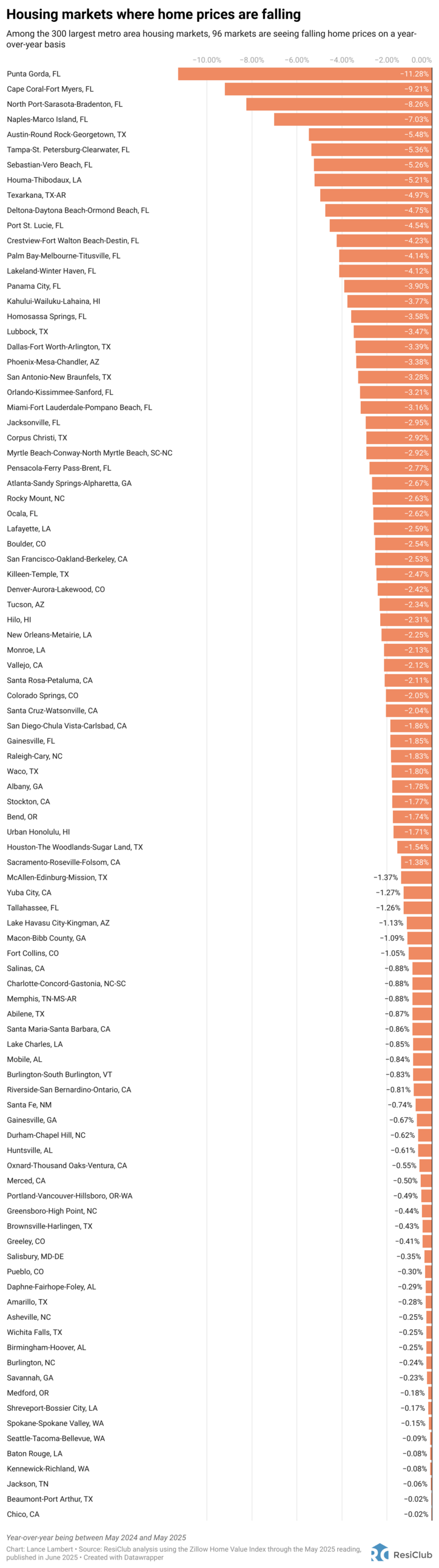 —> 96 of the nation’s 300 largest housing markets (i.e., 32% of markets) had a falling year-over-year reading in the May 2024 to May 2025 window.