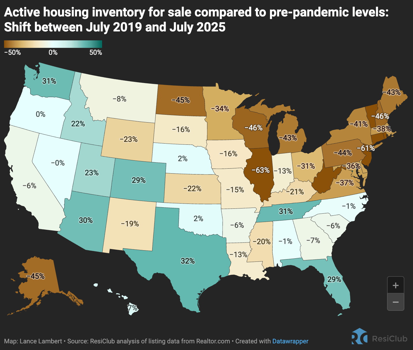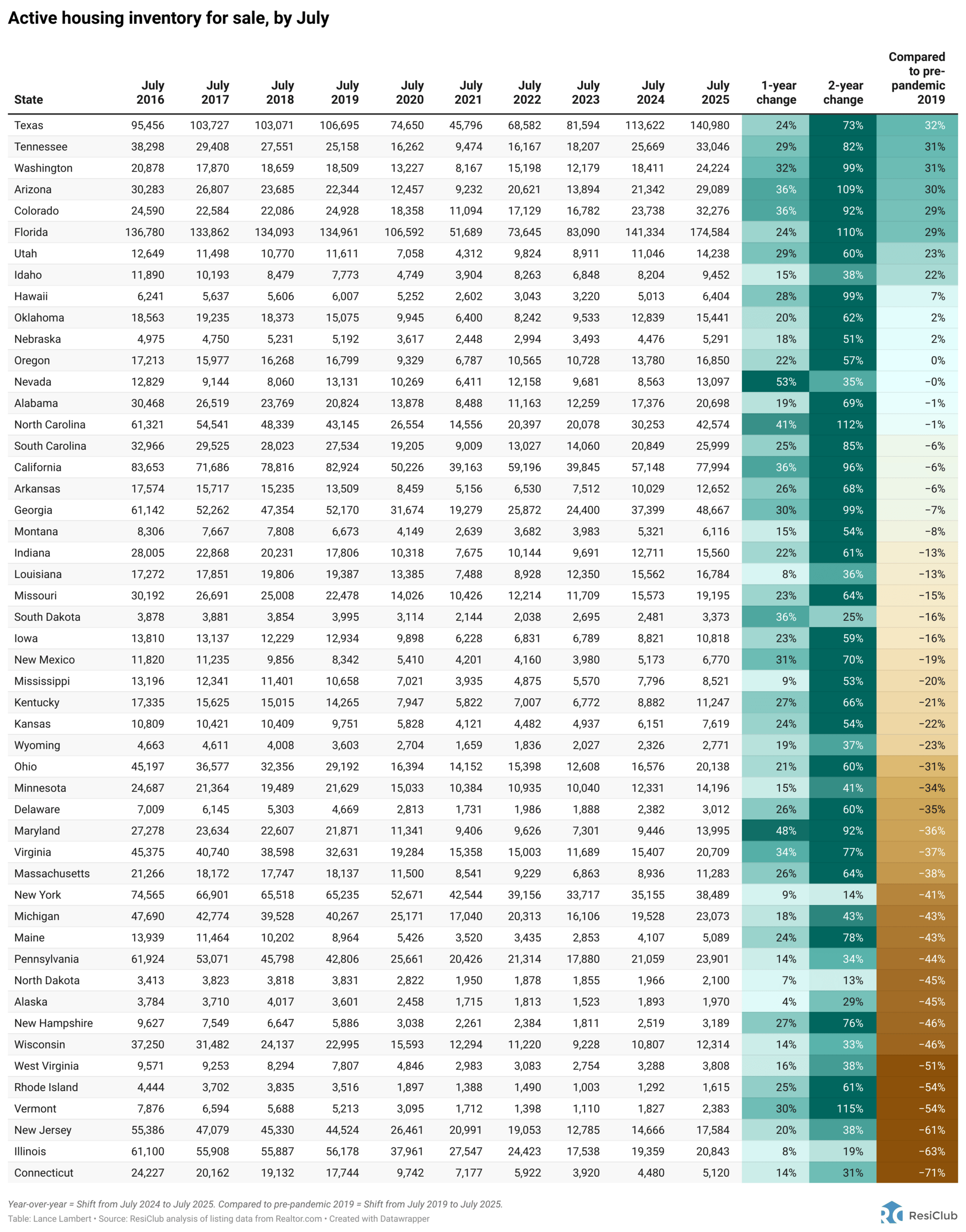 Right now, we’re looking at state inventory data. Tomorrow morning, ResiClub PRO members (paid tier) will get our monthly interactive deep dive analysis looking at inventory shifts and signals for over 800 metro areas, 3,000 counties, and 25,000 ZIP codes.