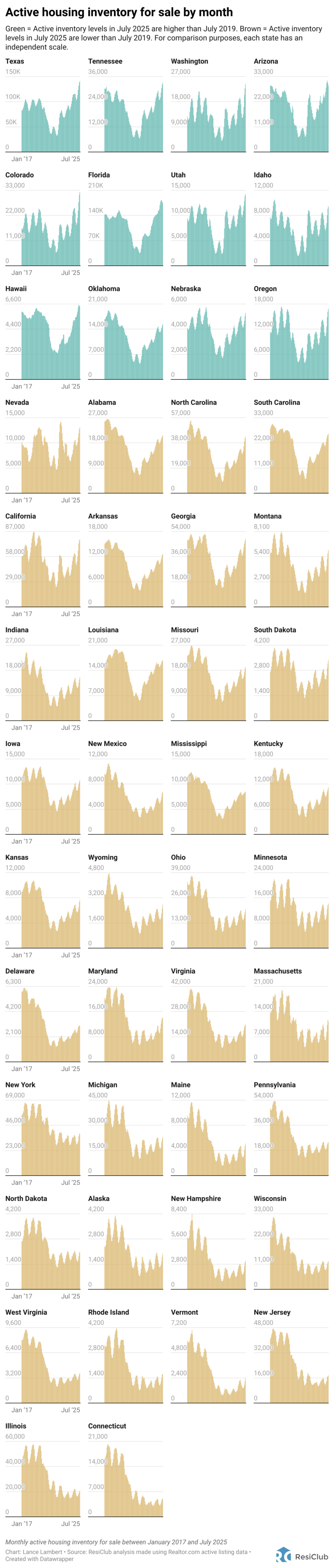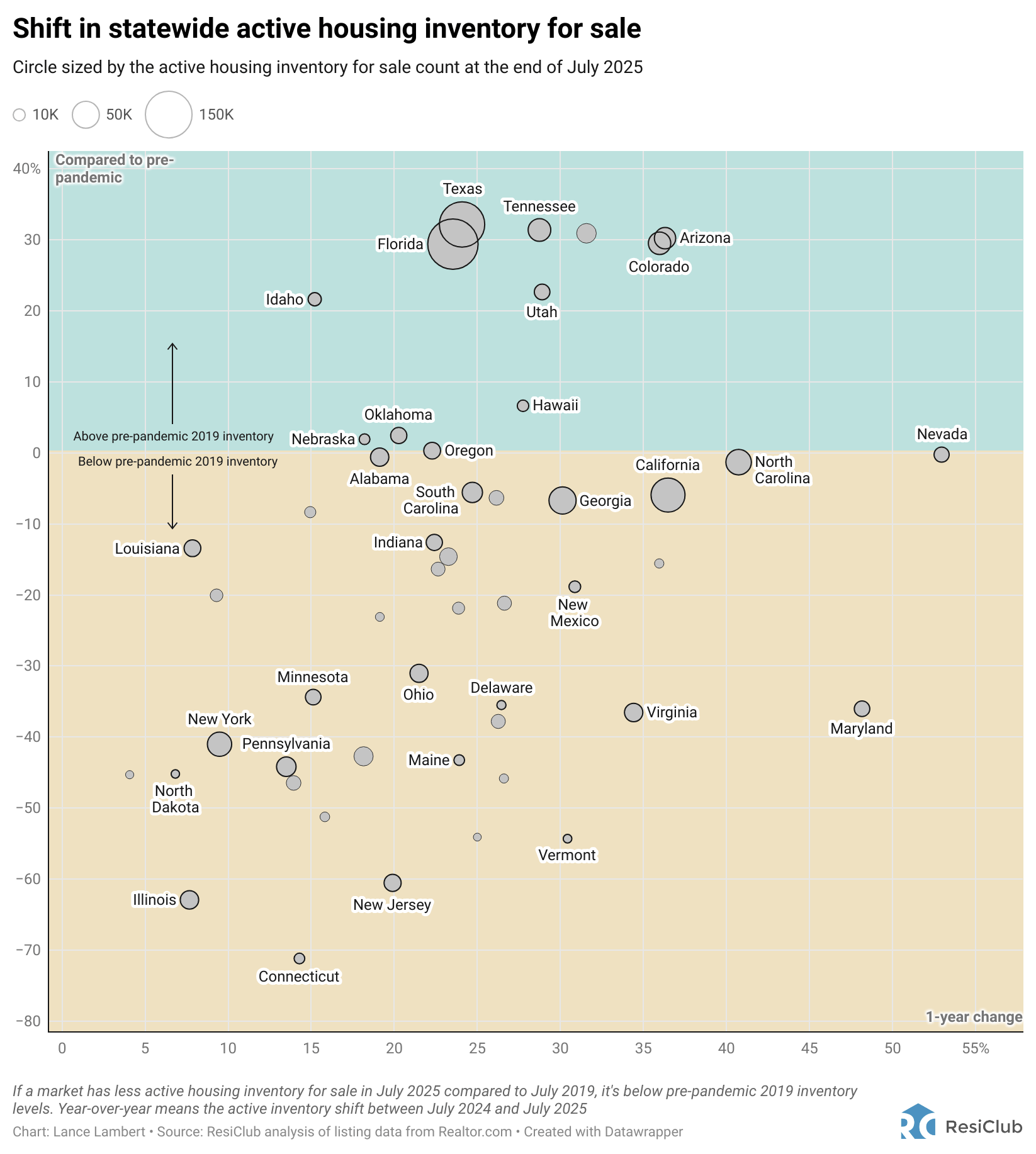 At the end of July 2025, 12 states were above pre-pandemic 2019 active inventory levels: Arizona, Colorado, Florida, Idaho, Hawaii, Nebraska, Oklahoma, Oregon, Tennessee, Texas, Utah, and Washington. (The District of Columbia—which we left out of this analysis—is also back above pre-pandemic 2019 active inventory levels too. Weakness in D.C. proper predates the current admin’s job cuts).