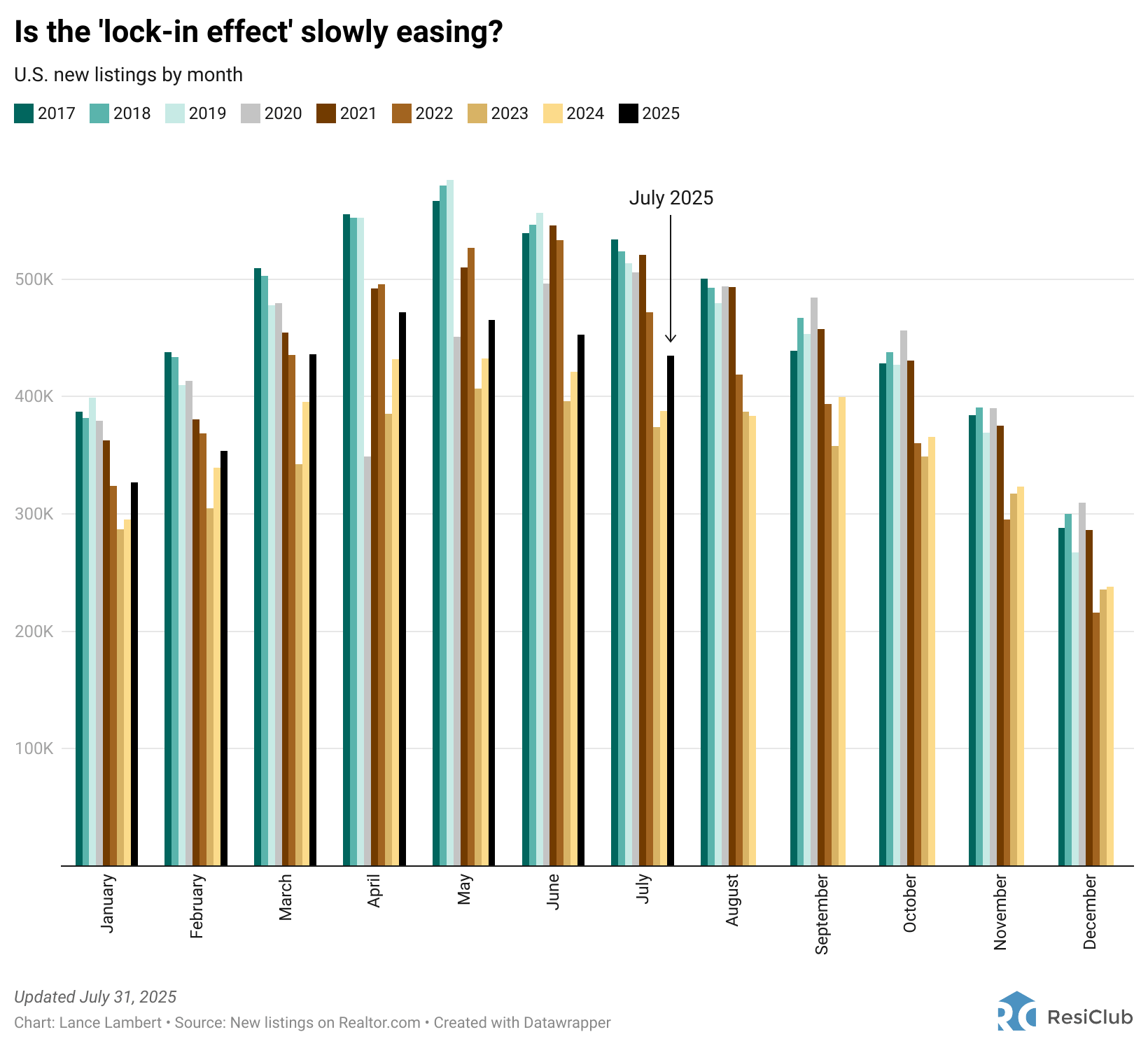 Look at the number of new listings in 2025—it’s higher than in 2023 and 2024. However, it hasn’t translated into a noticeable uptick in existing home sales. If new listings continue to rise and aren’t absorbed, it could put additional upward pressure on active inventory.