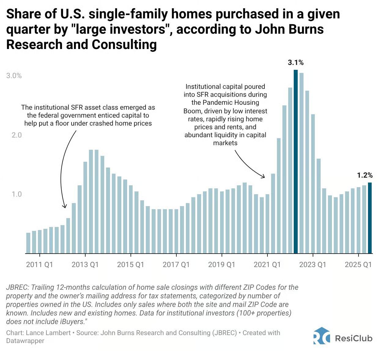 At the height of the Pandemic Housing Boom, large investors—those owning at least 100 single-family homes—made up an all-time high of 3.1% of home purchases in Q2 2022, according to John Burns Research and Consulting. That period, at the tail end of the boom, was when yields were particularly attractive as borrowing costs were ultra-low, home prices were soaring, and rents were climbing rapidly. However, since mortgage rates spiked and capital markets shifted, their share has fallen to around 1.0% of transactions over the past three years. The math isn’t as favorable right now.