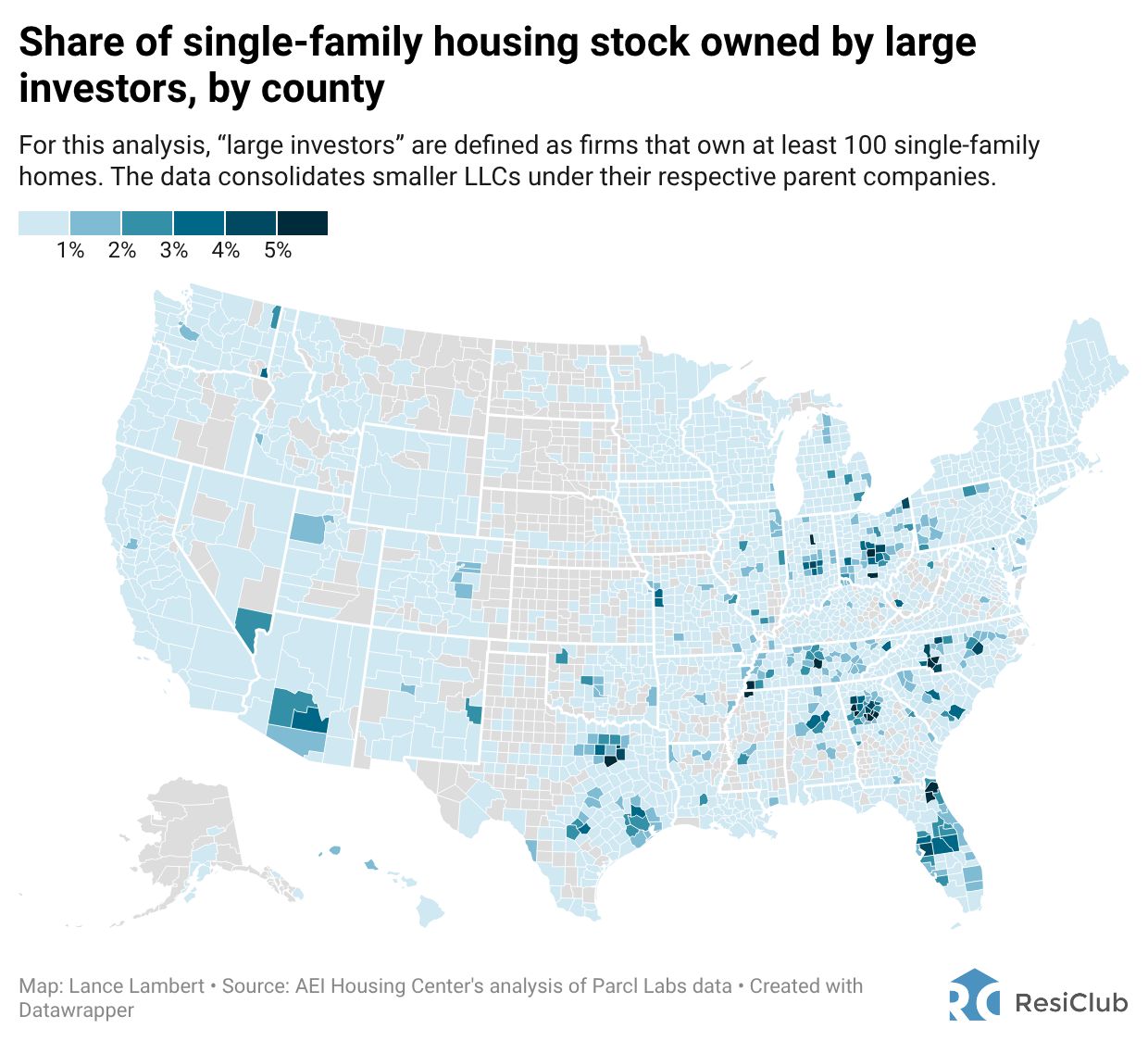 On a national level, “large investors”—those owning at least 100 single-family homes—only own around 1% of total single-family housing stock.