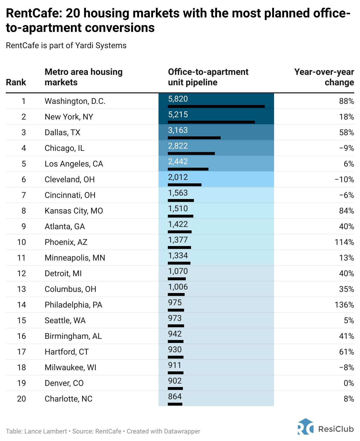To gain a comprehensive understanding of the current office-to-apartment conversions landscape, ResiClub turned to RentCafe, an arm of property management software giant Yardi Systems.