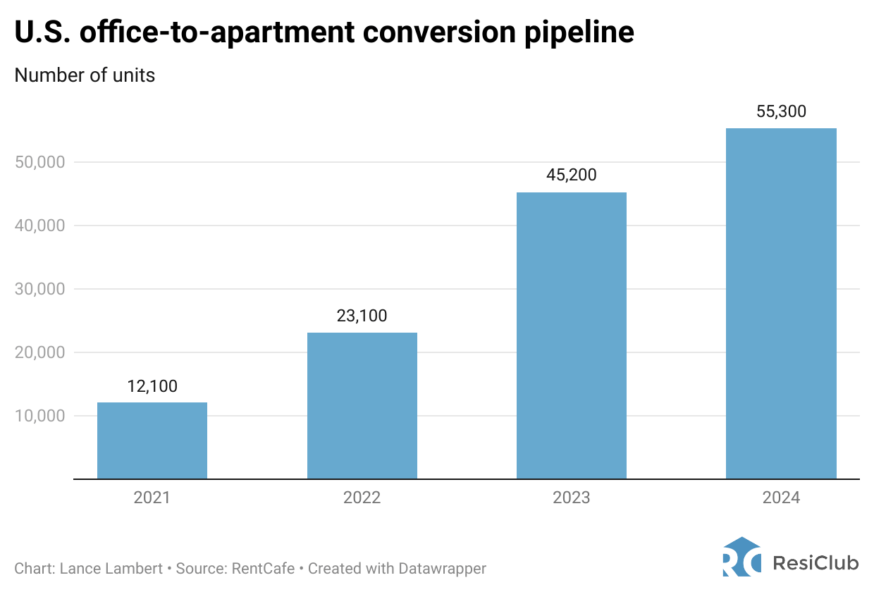 Entering 2021, there were 12,100 office-to-apartment units in the U.S. conversion pipeline. Fast-forward to 2024, and that figure is now 55,300—an increase of 357% in just three years.