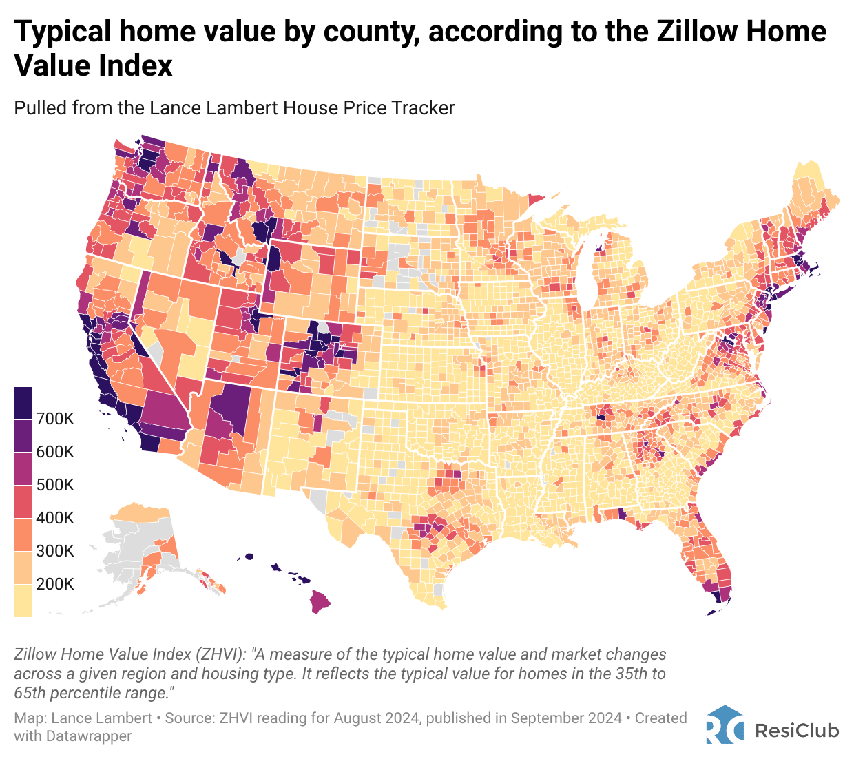 But just how much does that figure vary across the country? To find out, ResiClub took a closer look at the Zillow Home Value Index (ZHVI). Zillow’s index reflects the typical value for local homes in the 35th to 65th percentile range. It’s similar to a median price.