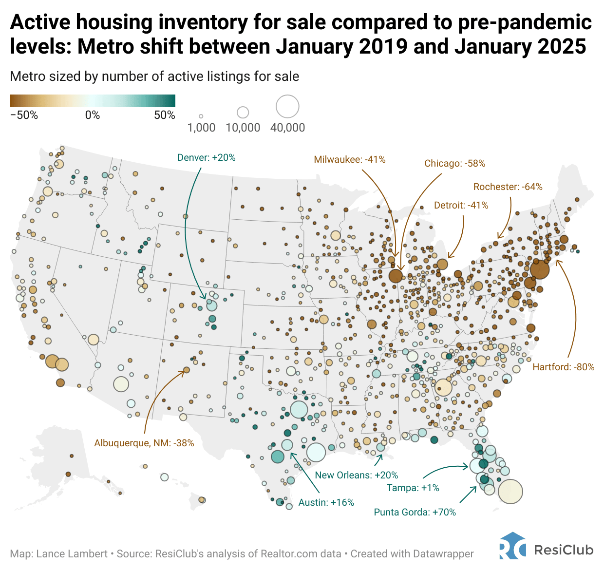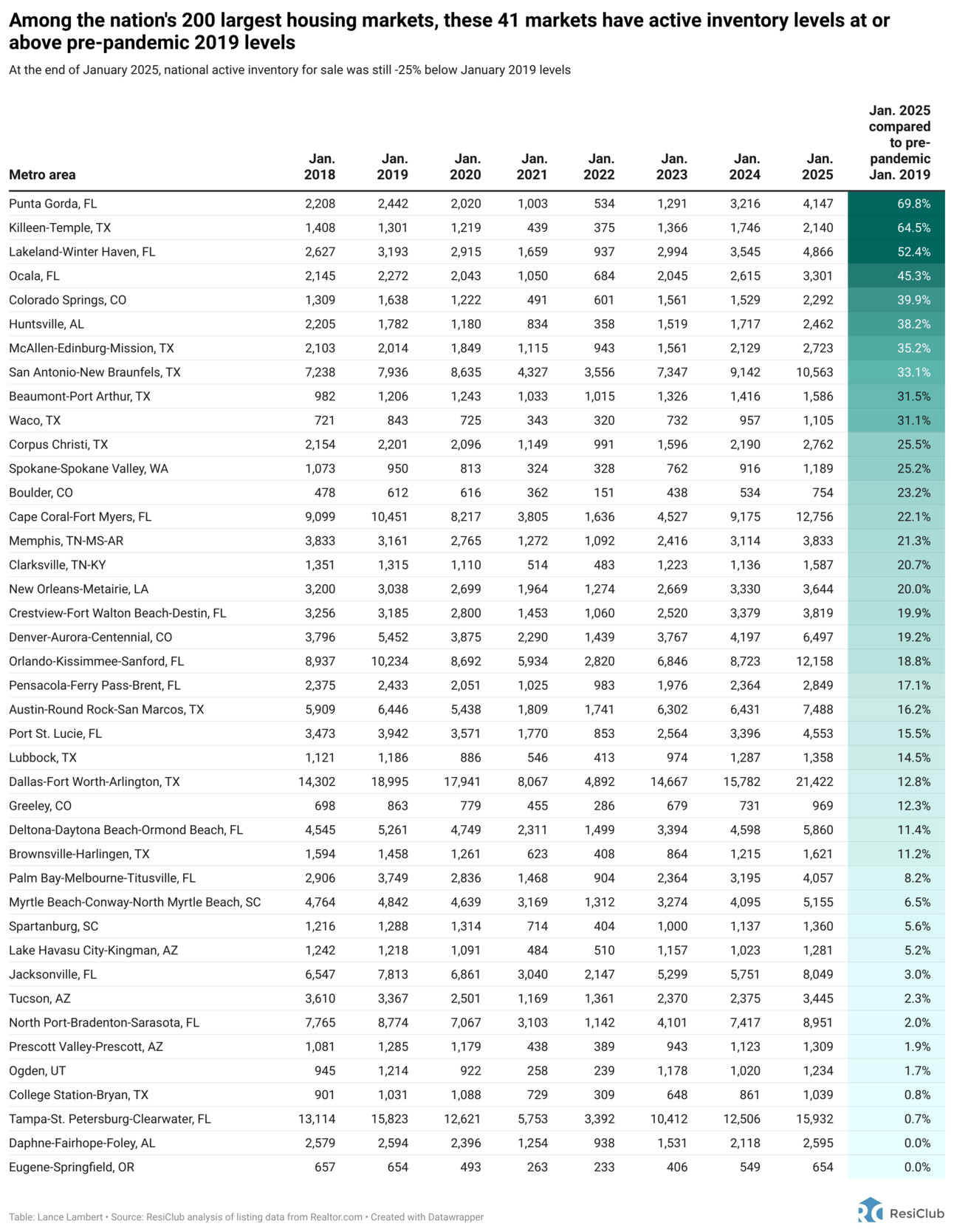 Among the nation’s 200 largest metro area housing markets, 41 markets ended January 2025 with more active homes for sale than they had in pre-pandemic January 2019. These are the places where homebuyers will be able to find the most leverage or market balance in 2025.