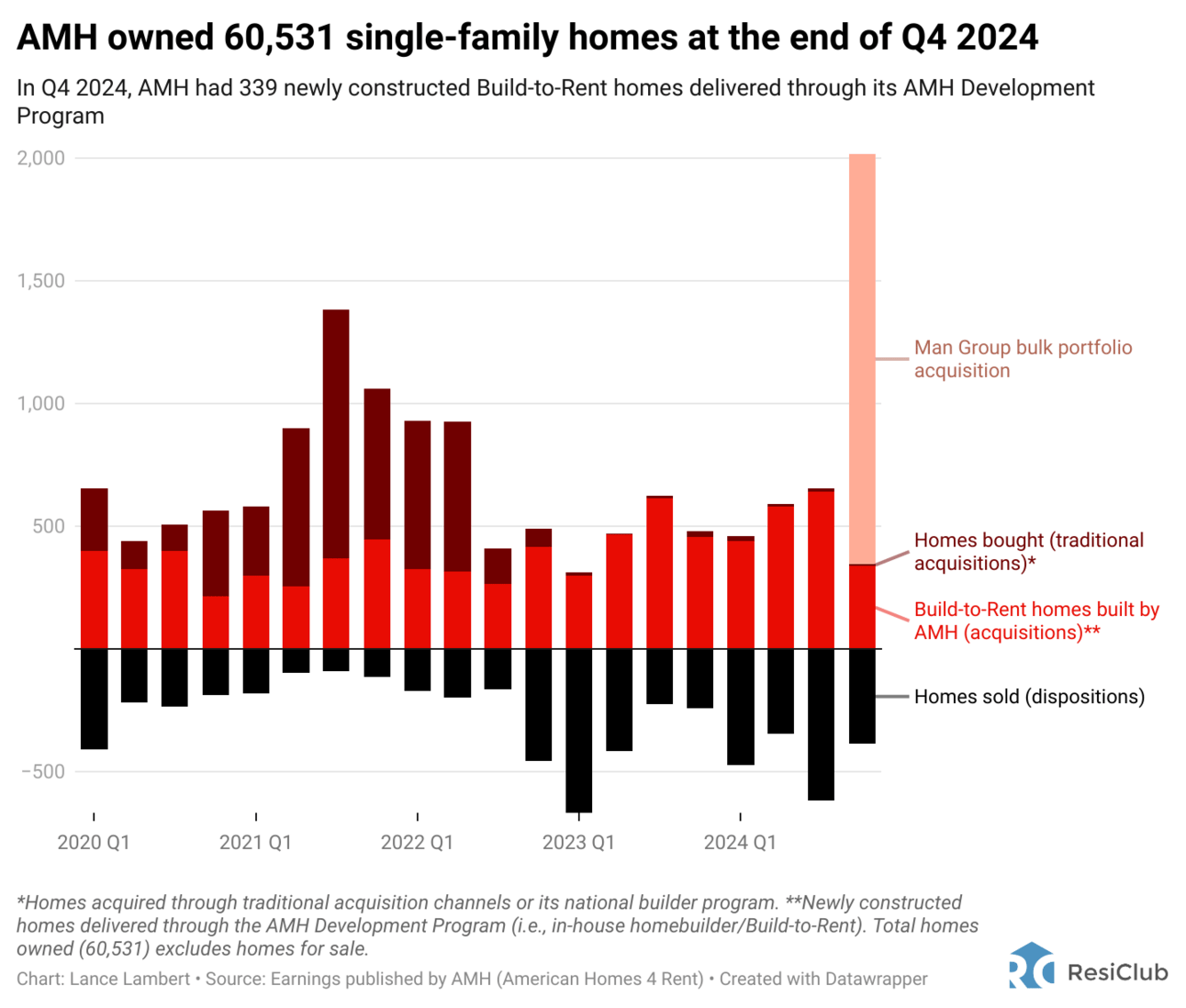 Institutional landlord AMH's portfolio of single-family homes jumped in Q4 2024 from 58,899 homes to 60,531 homes, according to its earnings report published this week.