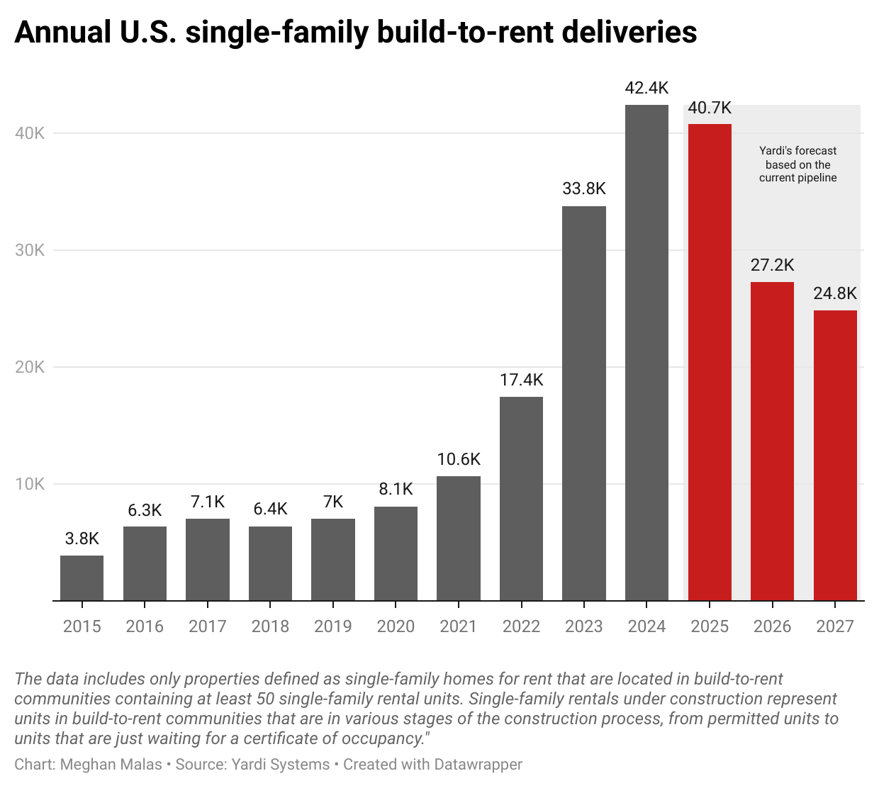 This week, housing economist Brad Hunter published some of Yardi Matrix’s latest forecast for single-family build-to-rent deliveries. We’re amid a period where build-to-rent deliveries are declining as the post-pandemic pipeline—supercharged by the easy-money period following the pandemic—winds down.