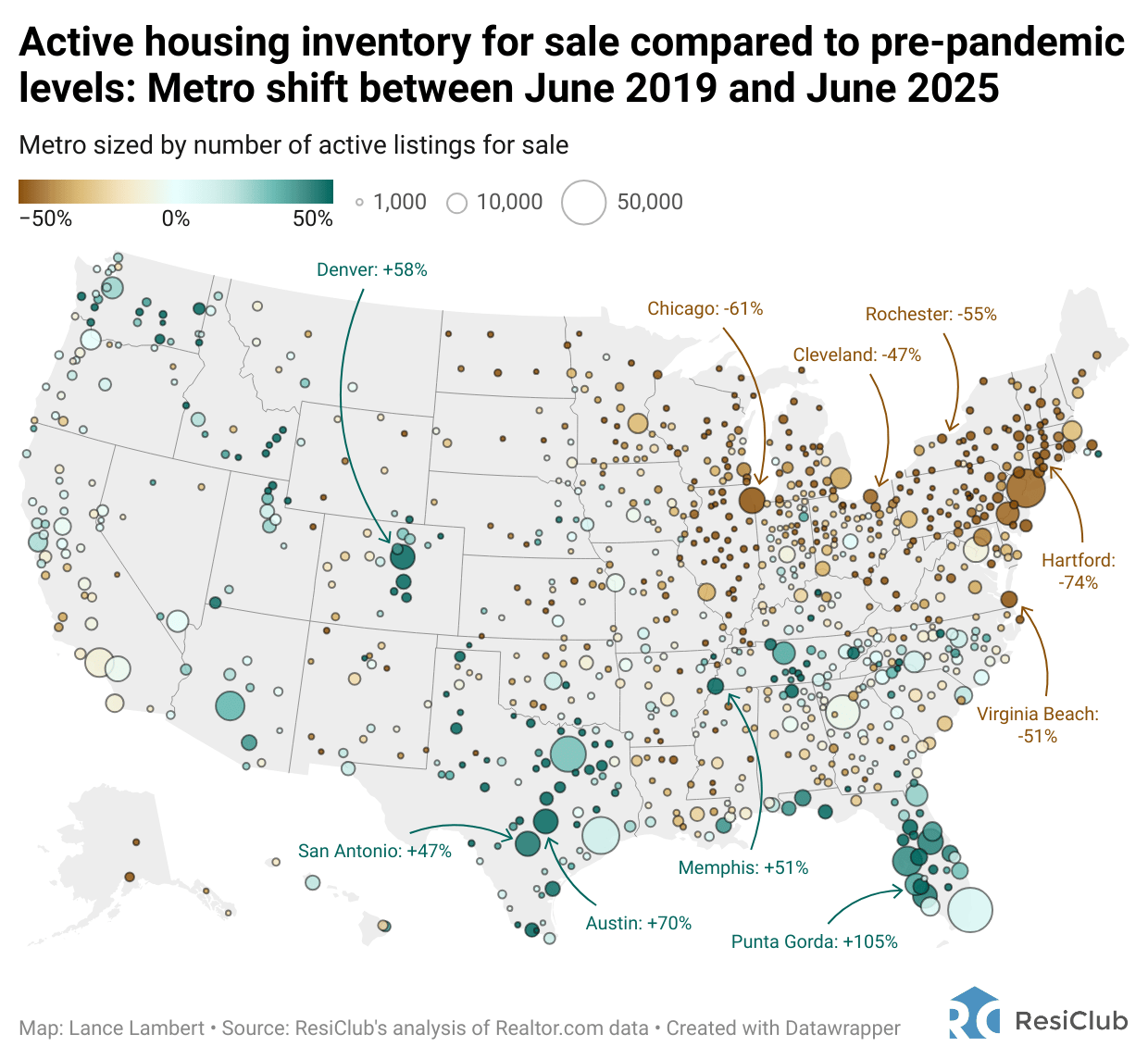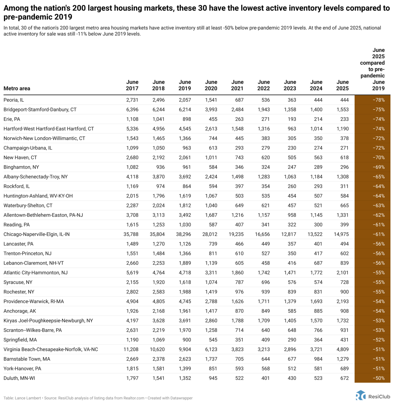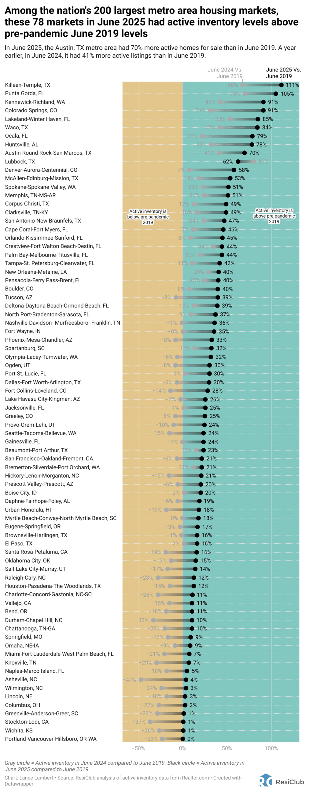 Now, at the latest reading for the end of June 2025, 78 of the 200 markets are above pre-pandemic 2019 inventory levels and ResiClub expects that count will continue to rise this year.