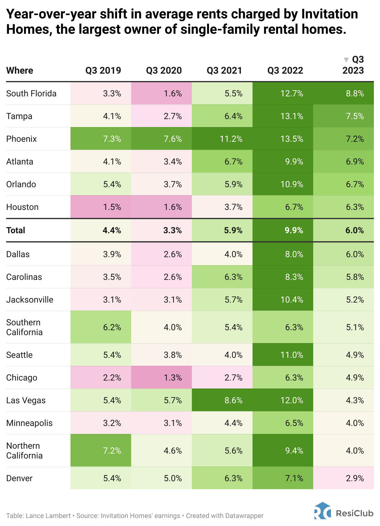 Look no further than Invitation Homes, America's largest single-family landlord, which reports a +6.0% increase in average single-family rent between Q3 2022 and Q3 2023. While this growth is slightly down from the +9.9% increase observed in the previous 12-month period (between Q3 2021 and Q3 2022), it remains elevated above pre-pandemic levels. Comparatively, between Q3 2018 and Q3 2019, Invitation Homes reported a +4.4% rise in average rent prices.