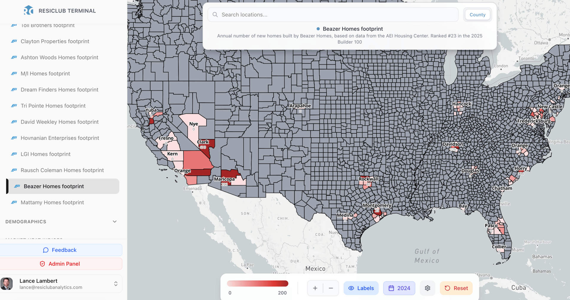 In the ResiClub Terminal, ResiClub PRO members can view data on publicly traded homebuilders’ footprints—see Beazer Homes’ footprint below 👇