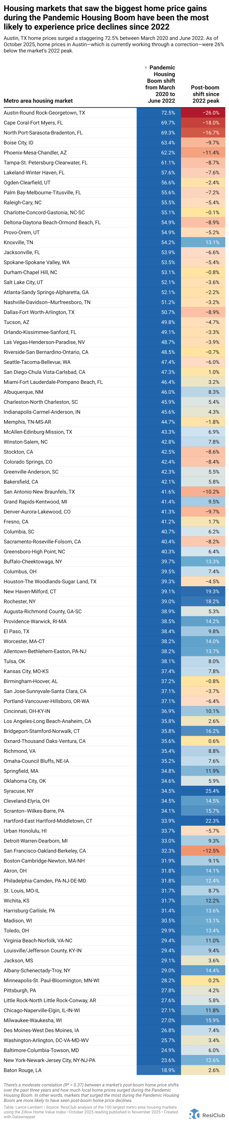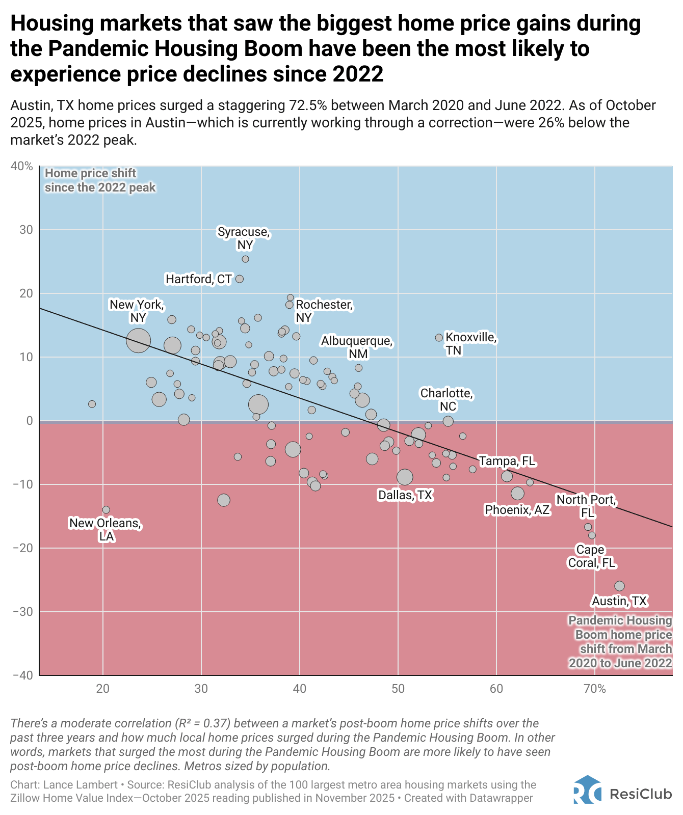 There’s a moderate statistical correlation (R² = 0.37) between home price shift between March 2020 and June 2022 and the change in home prices from their 2022 peak through the end of October 2025. If the New Orleans metro—the largest outlier—is excluded, that correlation strengthens slightly (R² = 0.44).