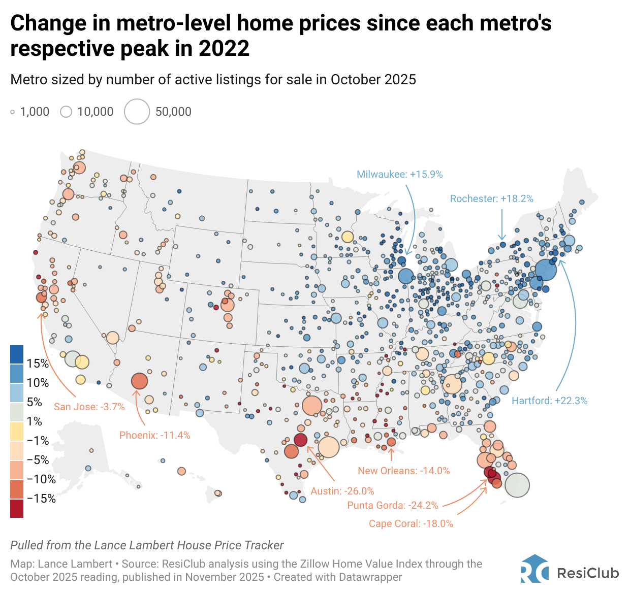 Austin being among the hardest-hit markets isn’t surprising. Back in May 2022, I wrote an article for Fortune outlining Austin’s heightened downside risk this cycle, driven in part by the fact that the market had significantly overheated and become markedly overvalued relative to underlying fundamentals, including local incomes.