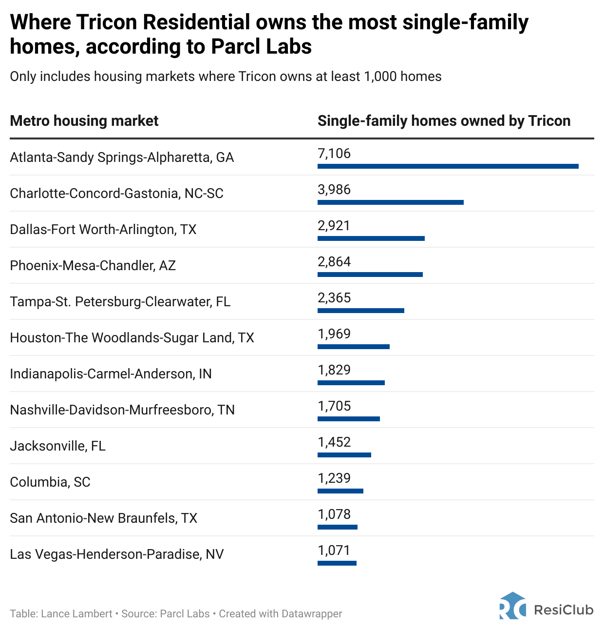 ResiClub reached out to Parcl Labs to get a real-time breakdown of Tricon’s U.S. single-family ownership. According to Parcl Labs, the biggest U.S. markets for Tricon are Atlanta (7,106 single-family homes), Charlotte (3,986 single-family homes), Dallas (2,921 single-family homes), Phoenix (2,864 single-family homes), and Tampa (2,365 single-family homes).