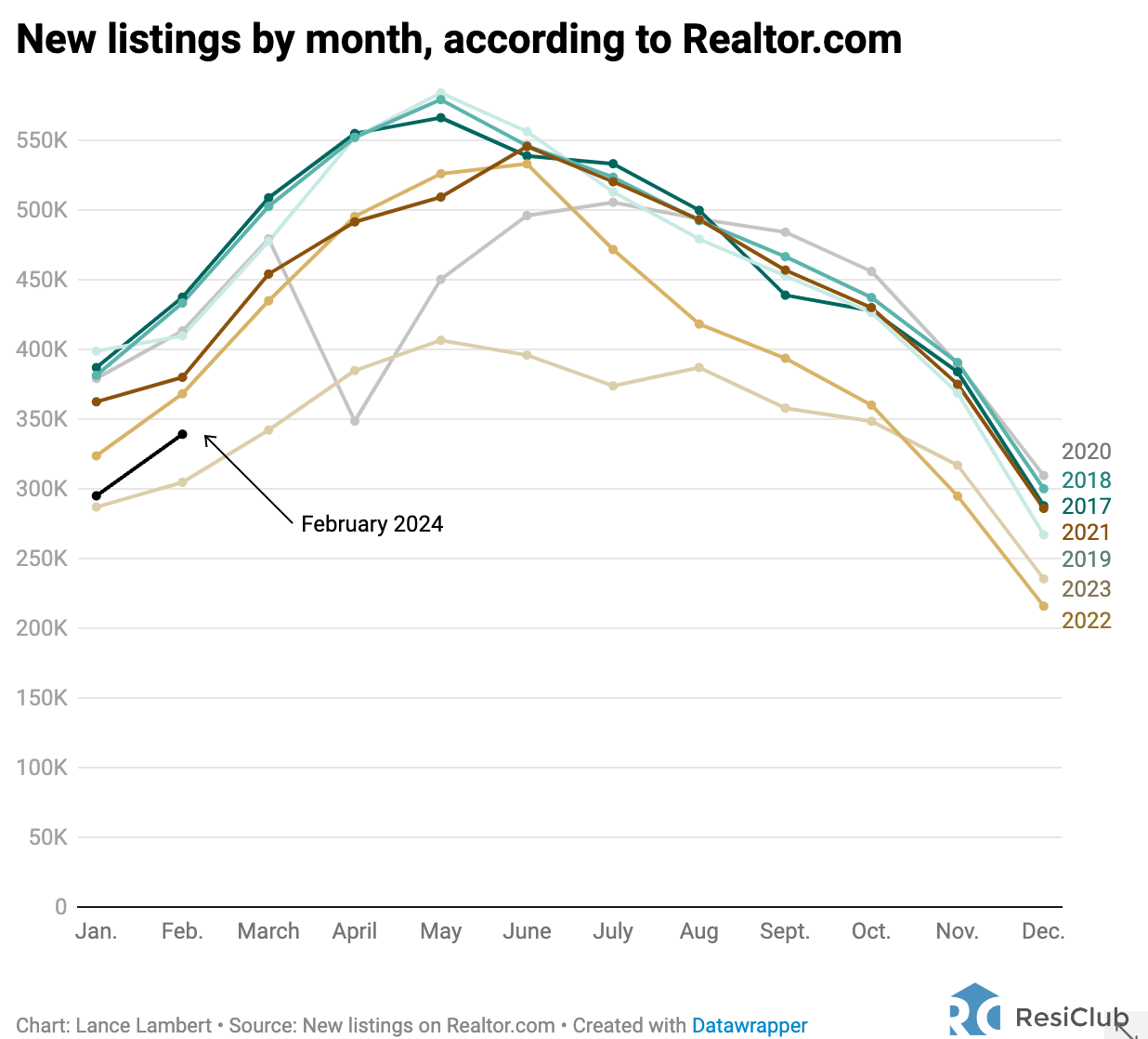 According to Realtor.com, in February 2024 there were 339,370 new listings, up +11% from February 2023, when there were 304,868 new listings. However, it's important to note that this figure is still -17% below the levels seen in February 2019, when there were 409,934 new listings. (Full month March figures drop on Thursday).