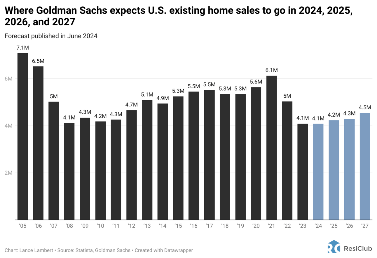Heading forward, Goldman Sachs expects that existing home sales will slowly drift up from 4.1 million in 2024 to 4.5 million in 2027. Not only is that far below the 6.1 million during the Pandemic Housing Boom in 2021, it’s also well below the 5.3 million U.S. existing home sales during “normal” times in 2019.