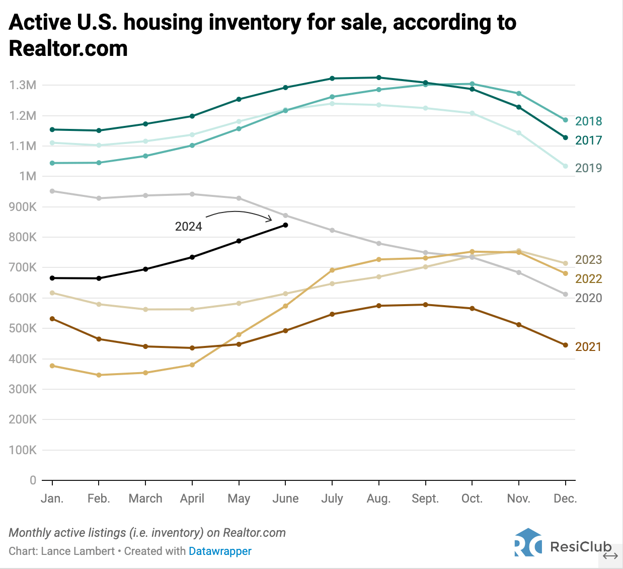 * Active listings (i.e. what ResiClub often calls “inventory”) = “The count of active listings within the specified geography during the specified month. The active listing count tracks the number of for sale properties on the market, excluding pending listings where a pending status is available. This is a snapshot measure of how many active listings can be expected on any given day of the specified month” according to Realtor.com.