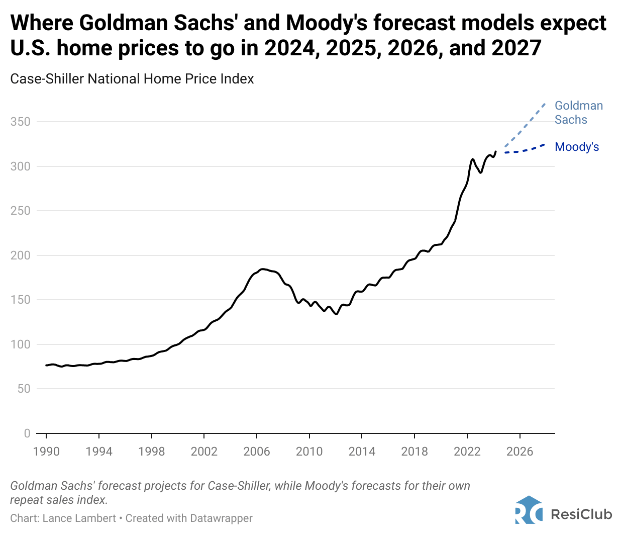While most home price forecasters publish only annual or 12-month outlooks, both Goldman Sachs and Moody's provide multiyear forecasts. Given that Goldman Sachs updated their 2024-2027 outlook last week, ResiClub reached out to Moody's to obtain their latest multiyear forecast for U.S. home prices.