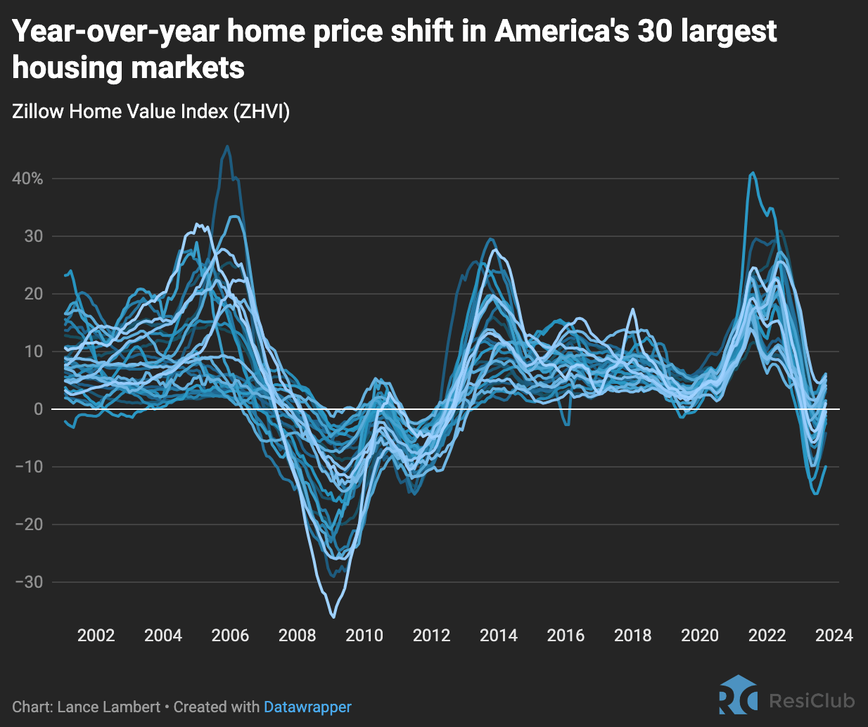 Among the 30 largest regional housing markets, 20 markets were down on a year-over-year basis in May 2023, according to the Zillow Home Value Index.
