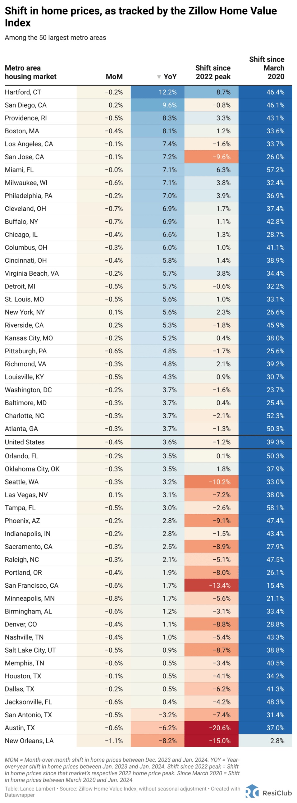 Nationally, home prices were up +3.6% between January 2023 and January 2024. Among the 50 largest housing markets, 47 markets are up on a year-over-year basis. Only Austin, San Antonio, and New Orleans are still falling on a year-over-year basis.