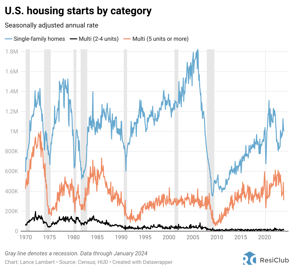 However, a lot of these apartments were financed when interest rates were still at ultralow levels. After 2024, multifamily completions should roll over. At least that's what housing starts, permits, and private surveys are signaling.
