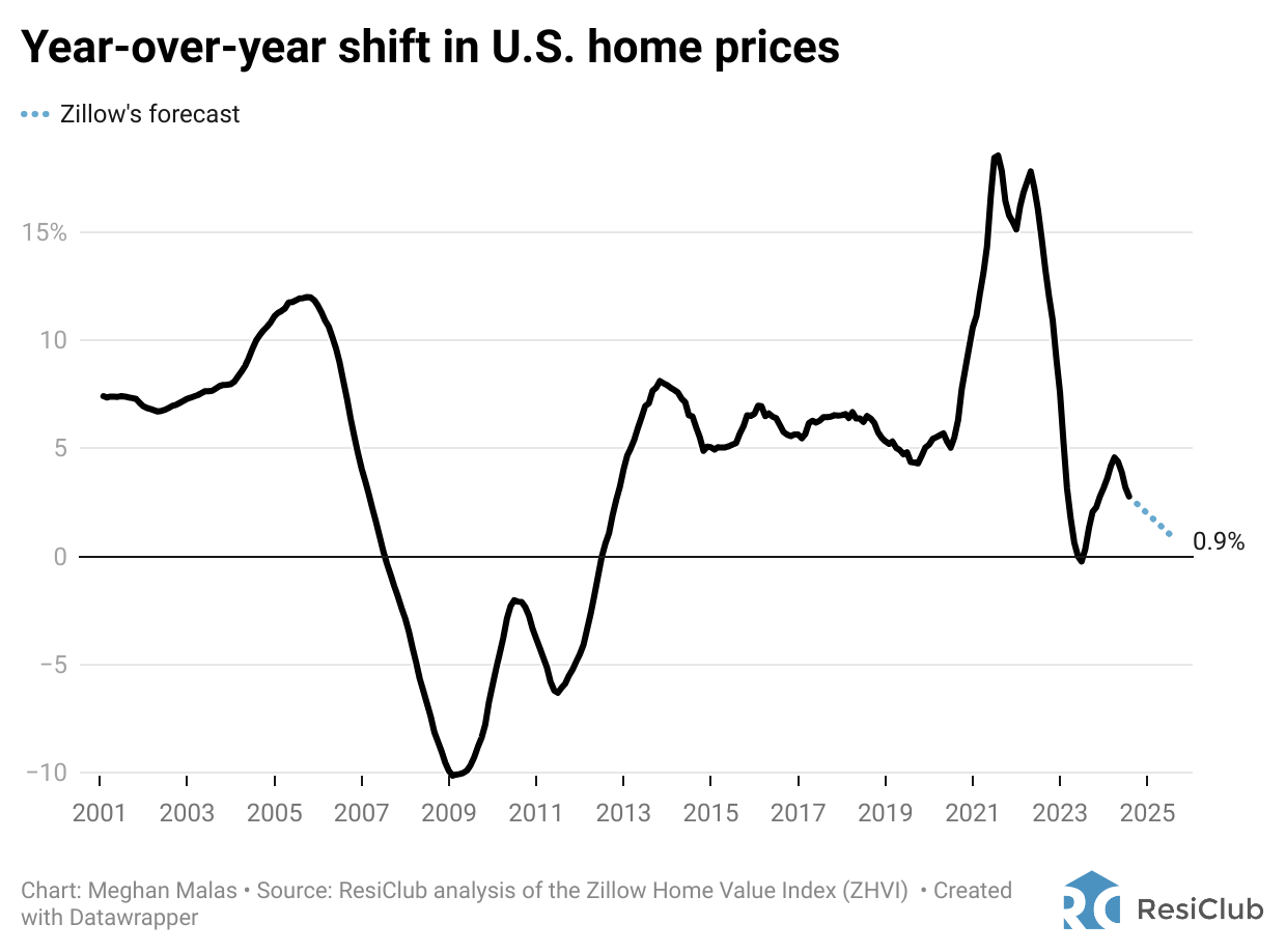 Zillow’s latest revised forecast expects U.S. home prices to rise just +0.9% over the next 12 months, from July 2024 to July 2025.