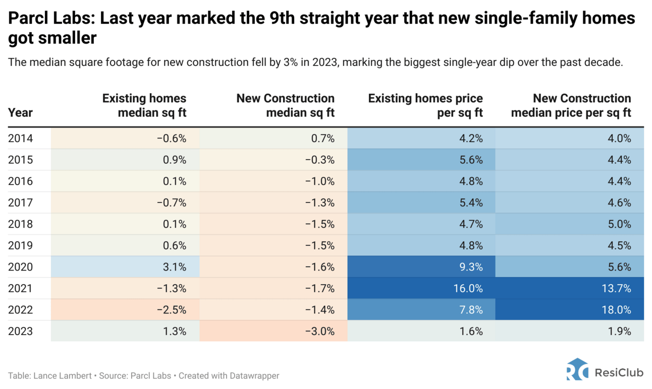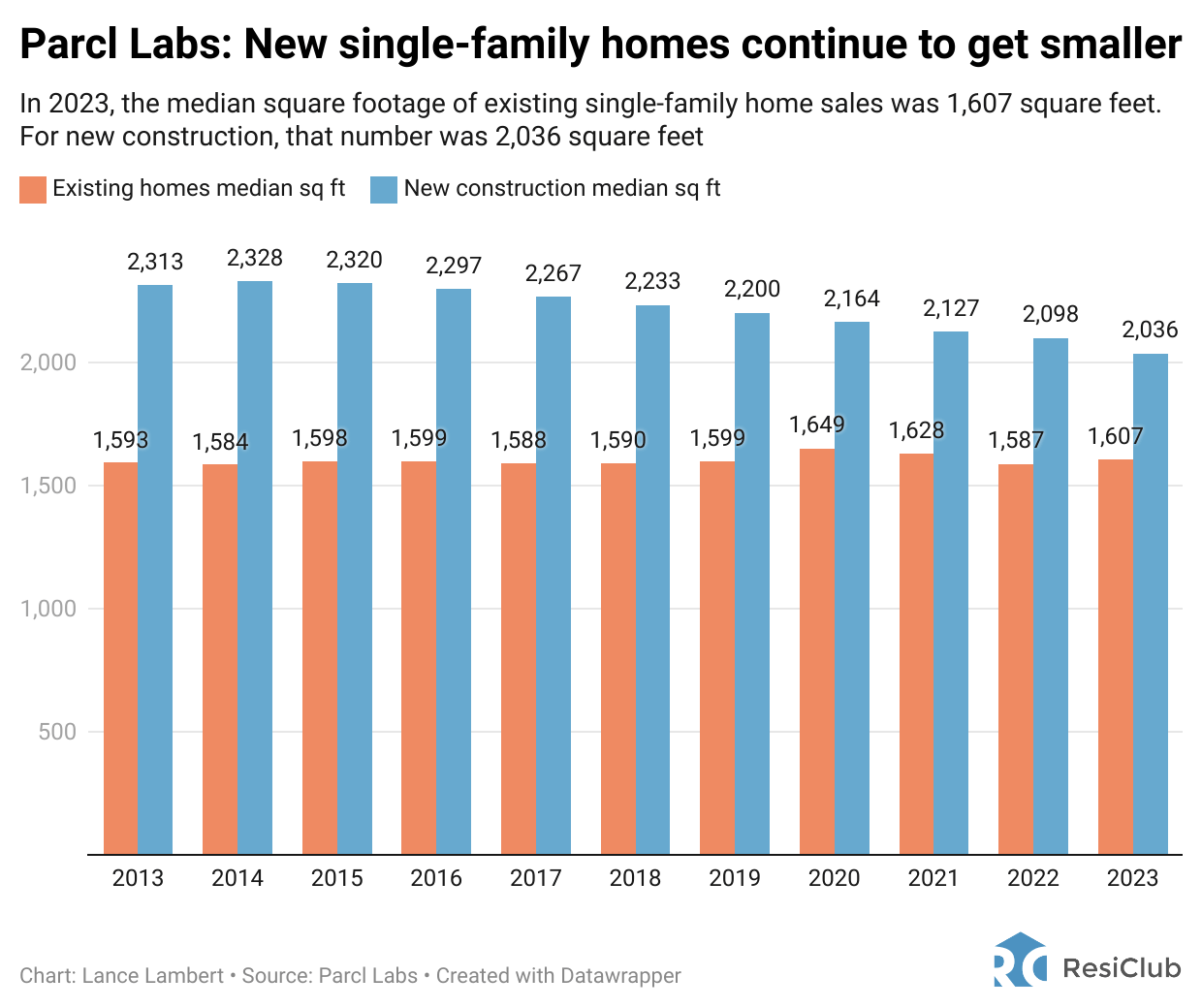 In fact, Parcl Labs data shows that 2023 marked the 9th straight year that new single-family homes got smaller, going from a median square footage of 2,328 in 2014 to 2,036 in 2023.