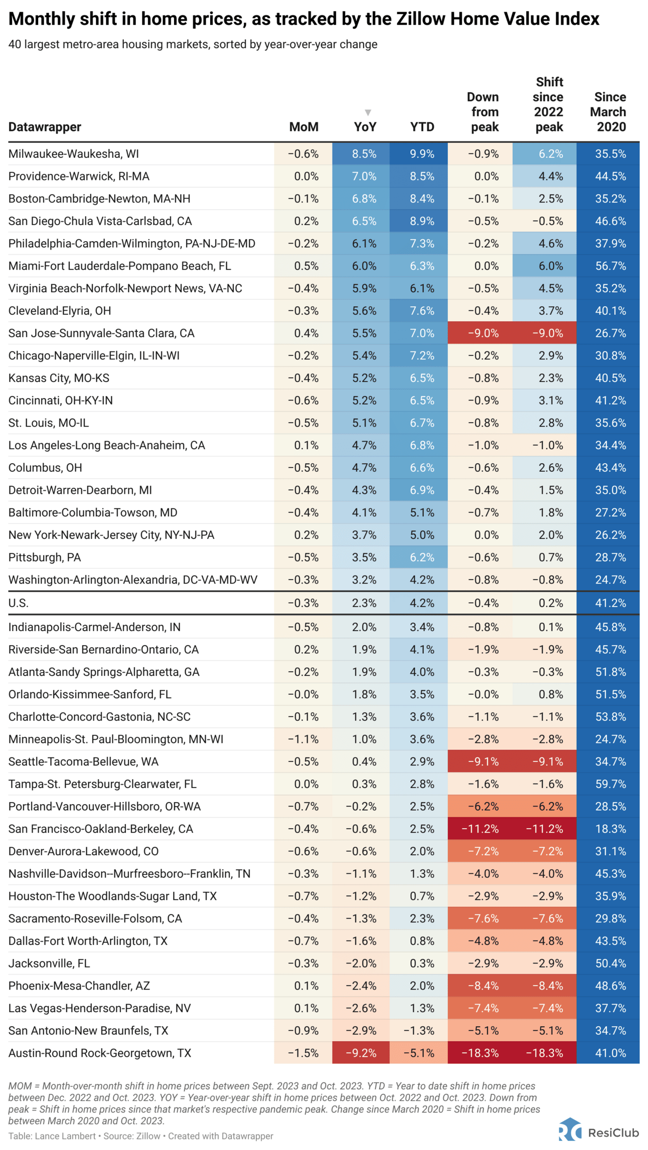 Earlier this week, we got the latest home price reading from the Zillow Home Value Index. It showed that U.S. home prices fell -0.3% between September and October, while on a year-over-year basis were up +2.3%.