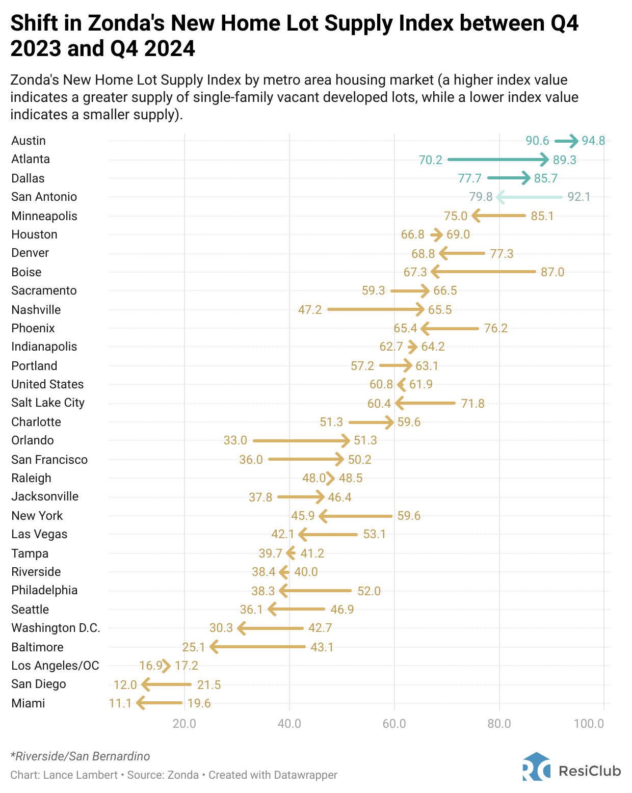 Housing markets like Atlanta, Nashville, and Orlando experienced some of the most significant year-over-year loosening of lot supply.
