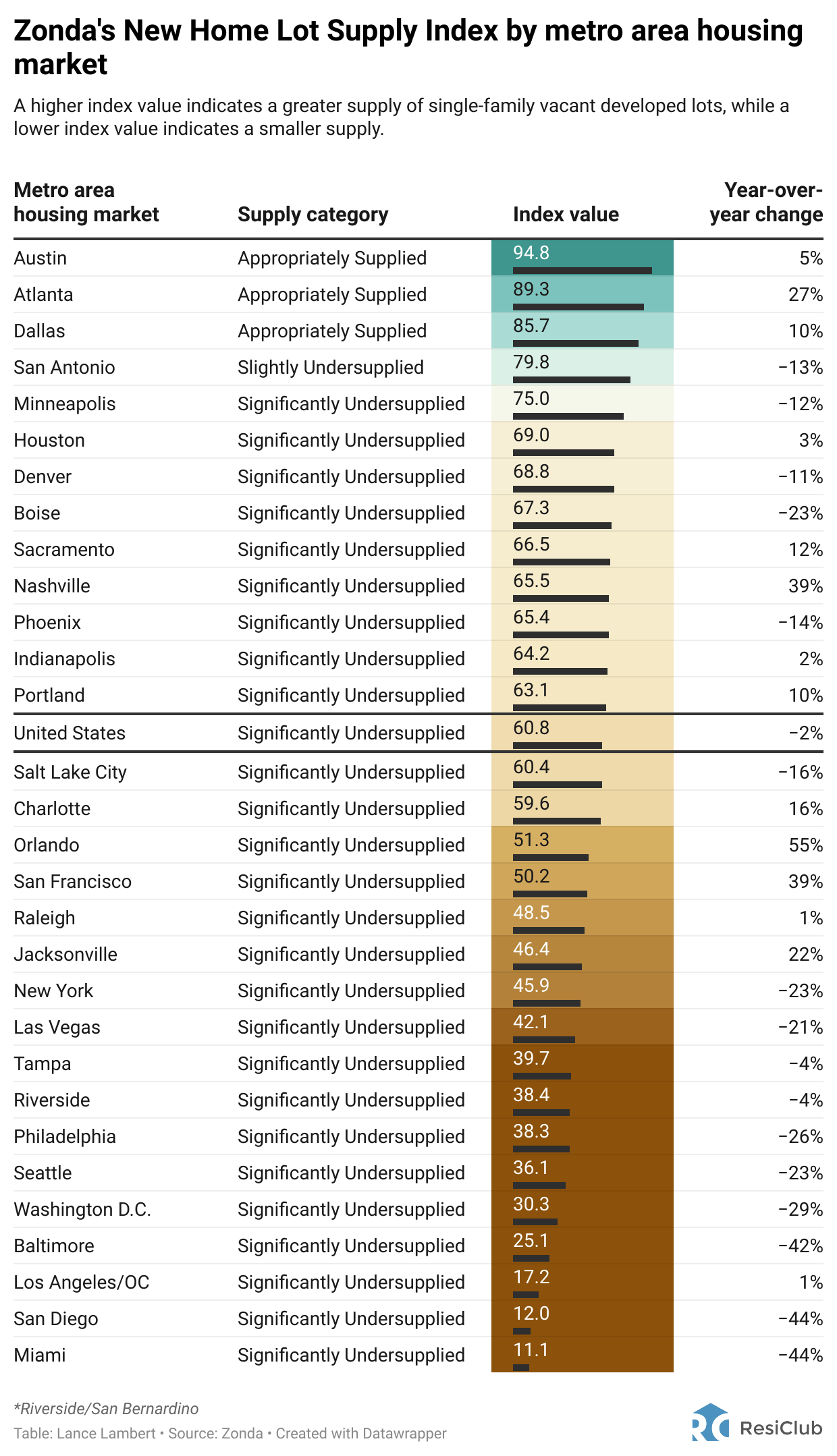 The only three “appropriately supplied” housing markets for lot/land supply are Austin, Atlanta, and Dallas.