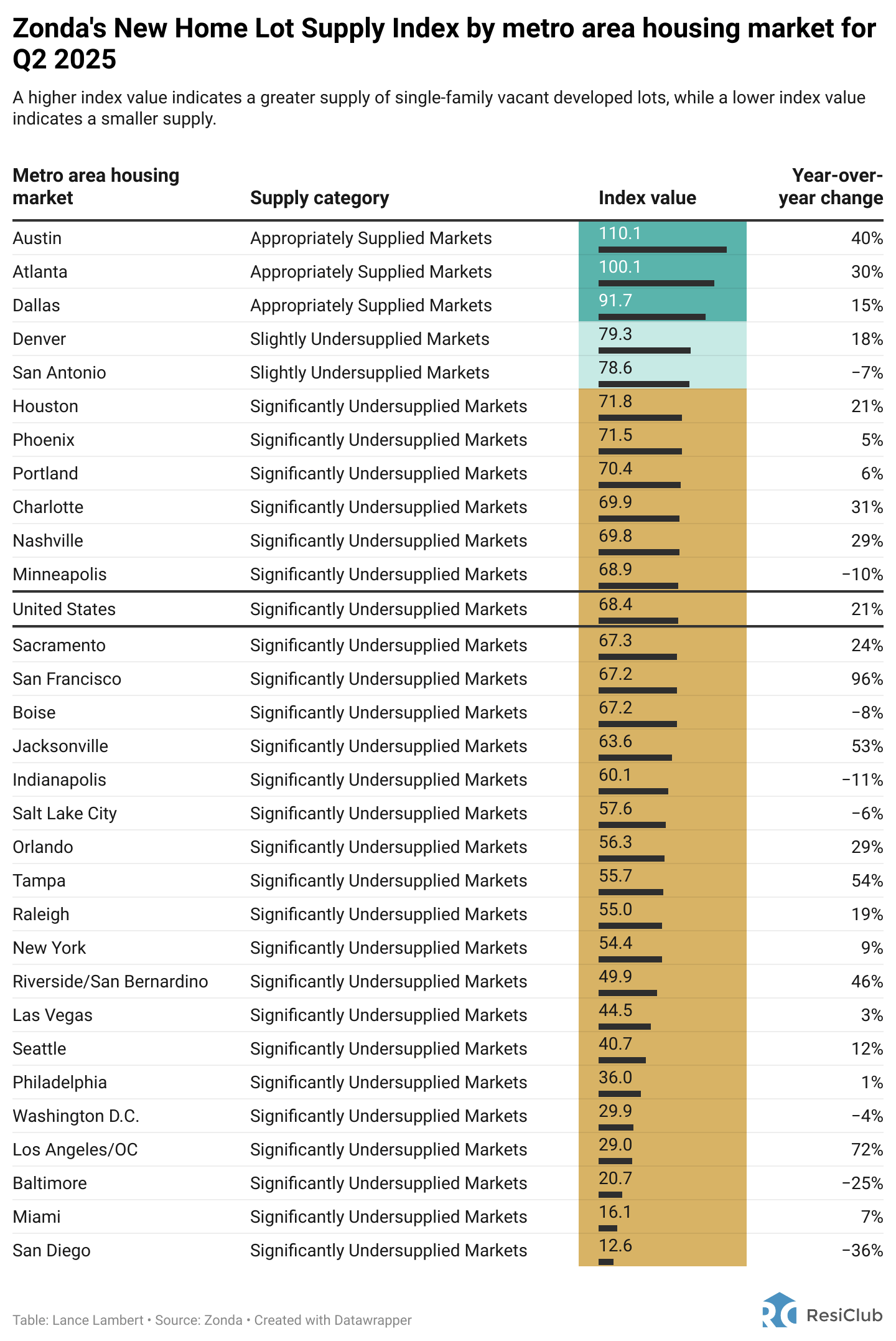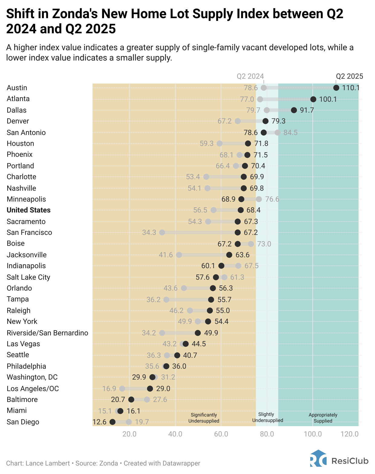 According to Zonda, three major metro area housing markets now are “appropriately supplied” for lot/land supply: Austin, Atlanta, and Dallas.