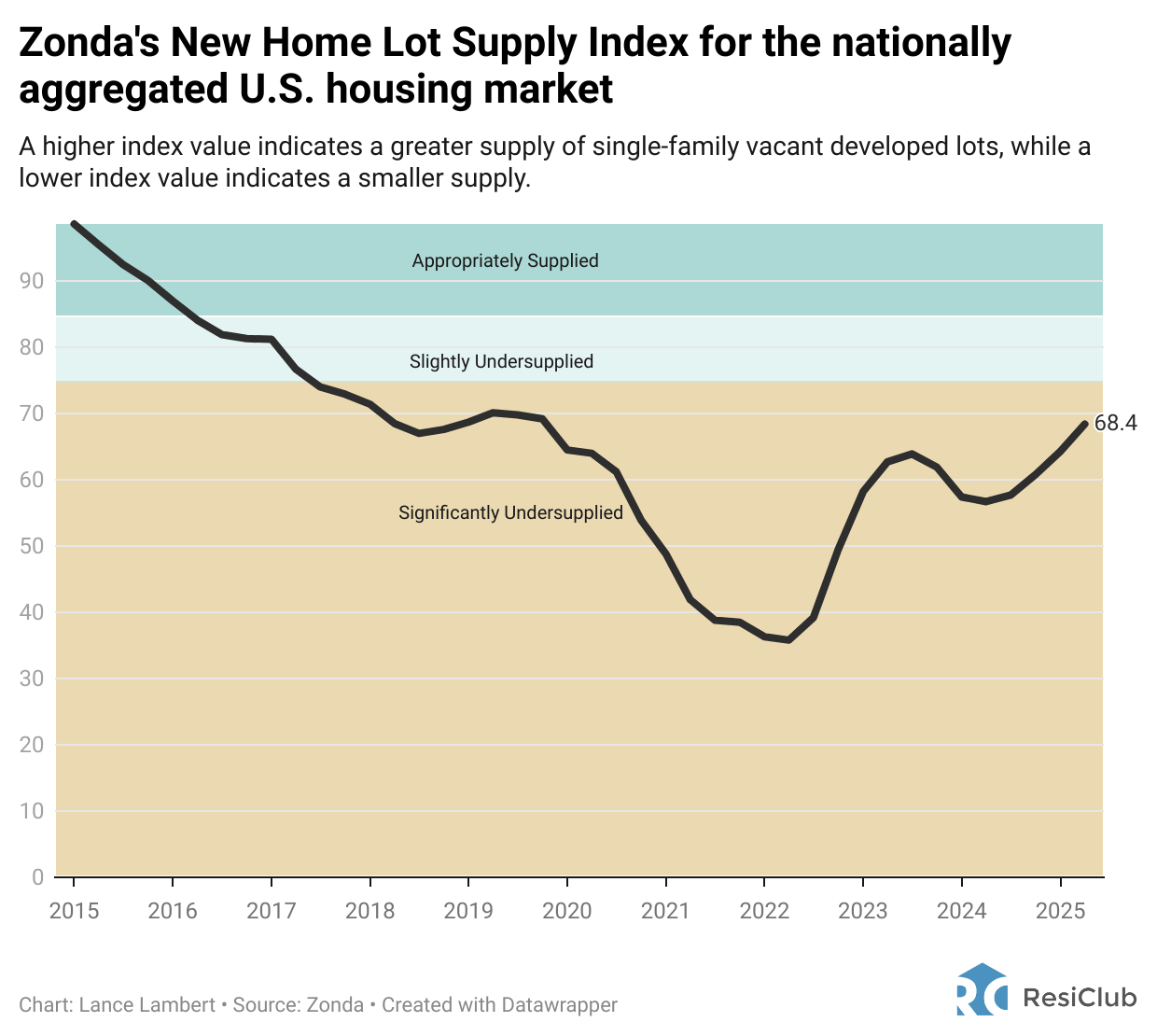 That index in Q2 2025 climbed to 68.4—well above the all-time low of 35.8 set at the height of the Pandemic Housing Boom in Q2 2022, when builders were buying as much entitled land as they could find.
