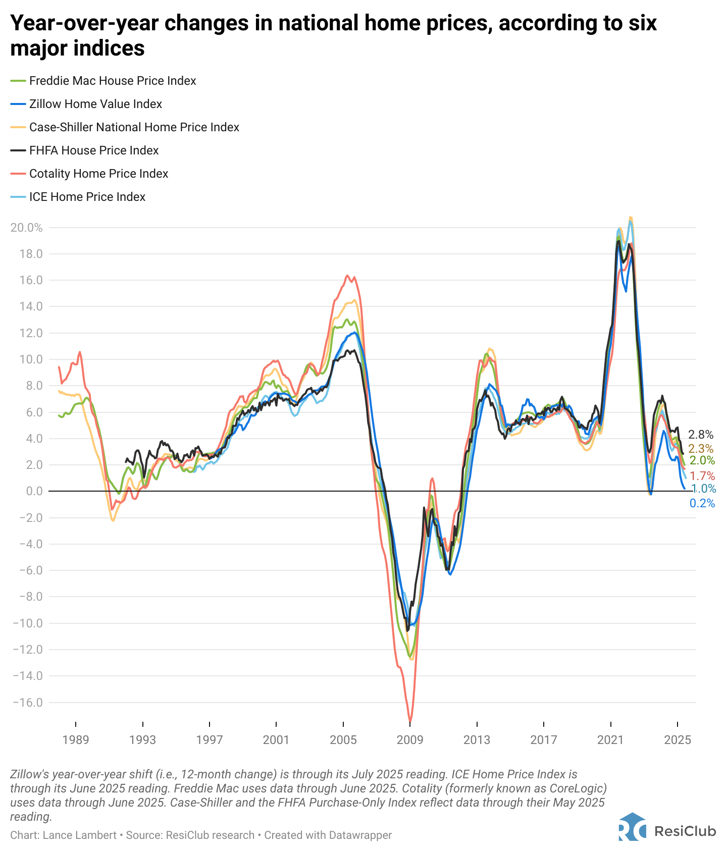 Depending on the index, the year-over-year figure will always vary. However, directionally, they (nationally aggregated home prices) tend to move the same way—and right now, that direction is softening/deceleration.