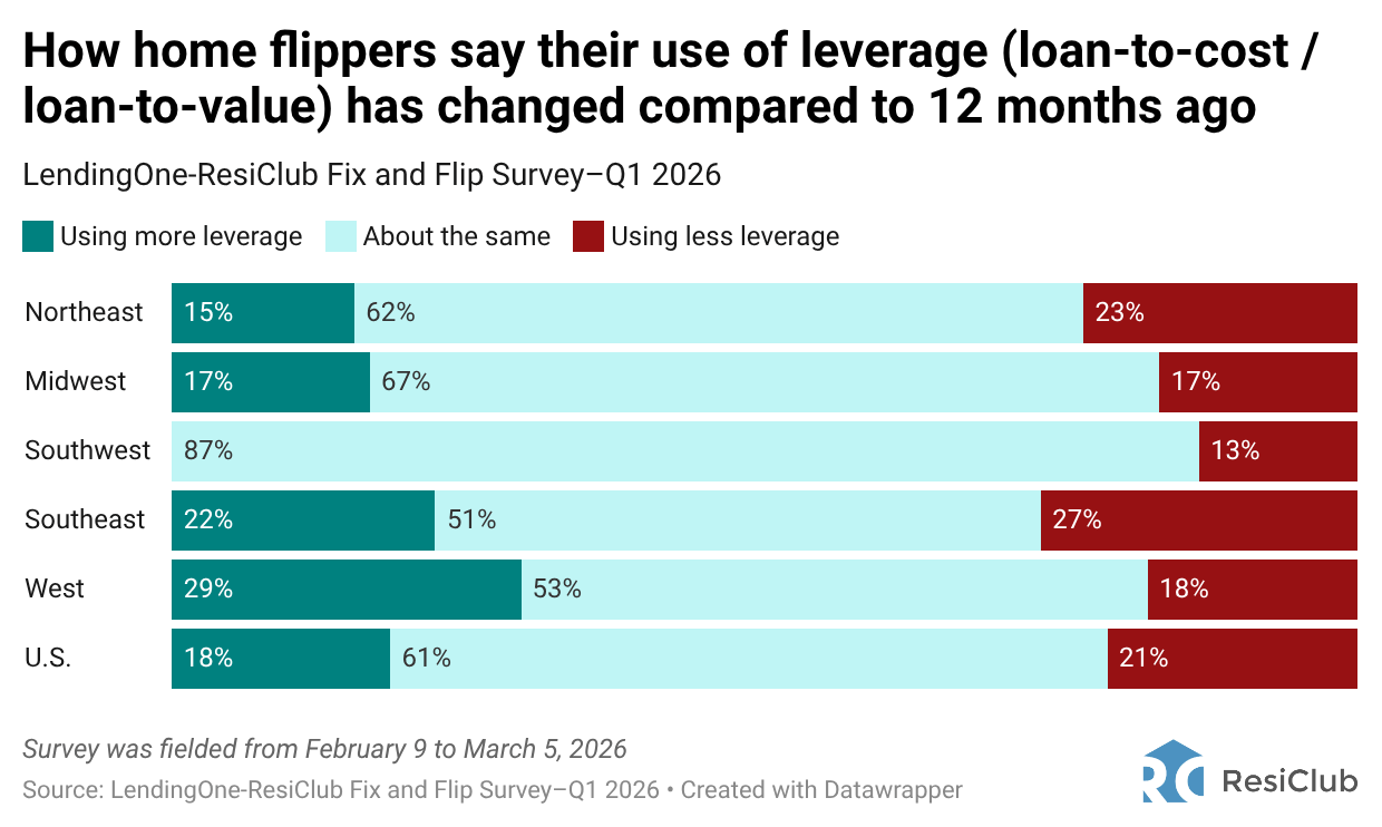 61% of U.S. home flippers say their use of leverage is about the same compared to 12 months ago, meanwhile, 21% say they are using less leverage, and 18% say they are using more.