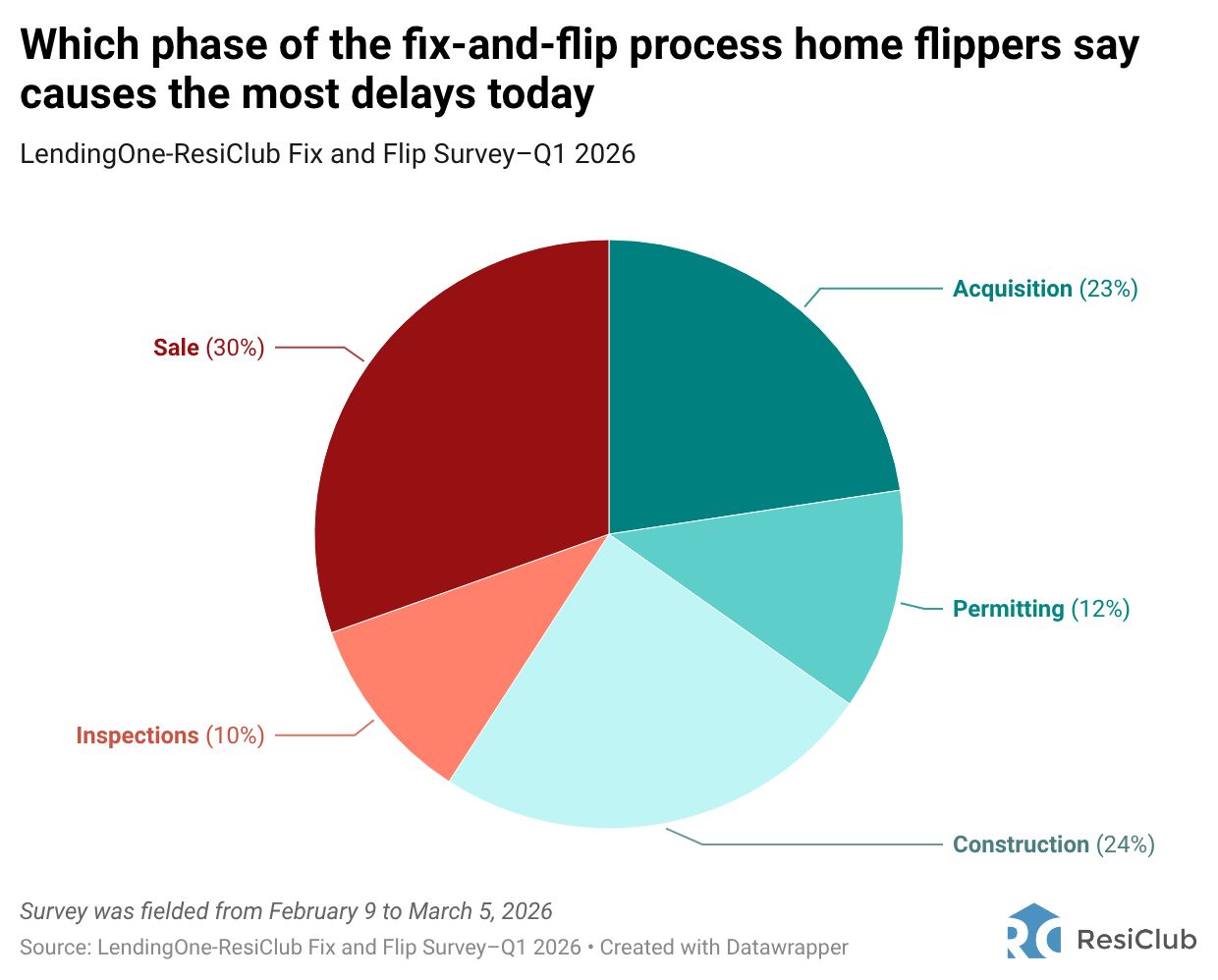 The sale phase causes the most delays (30%) for U.S. home flippers, followed by rehabbing/construction (24%) and acquisition (23%).