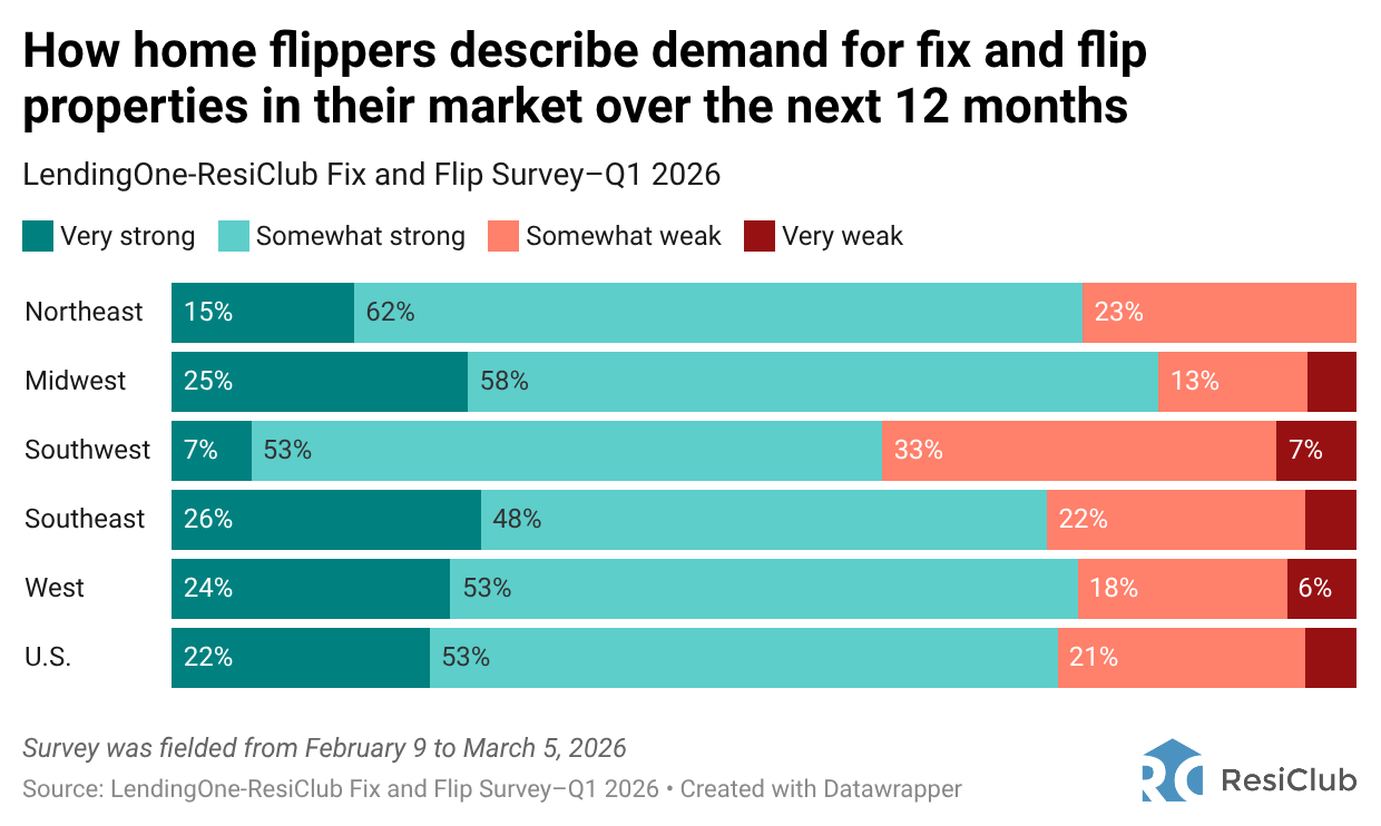 Home flippers in the Midwest are the most confident in buyer demand, with 83% describing conditions as either somewhat strong or very strong—the highest share of any region.