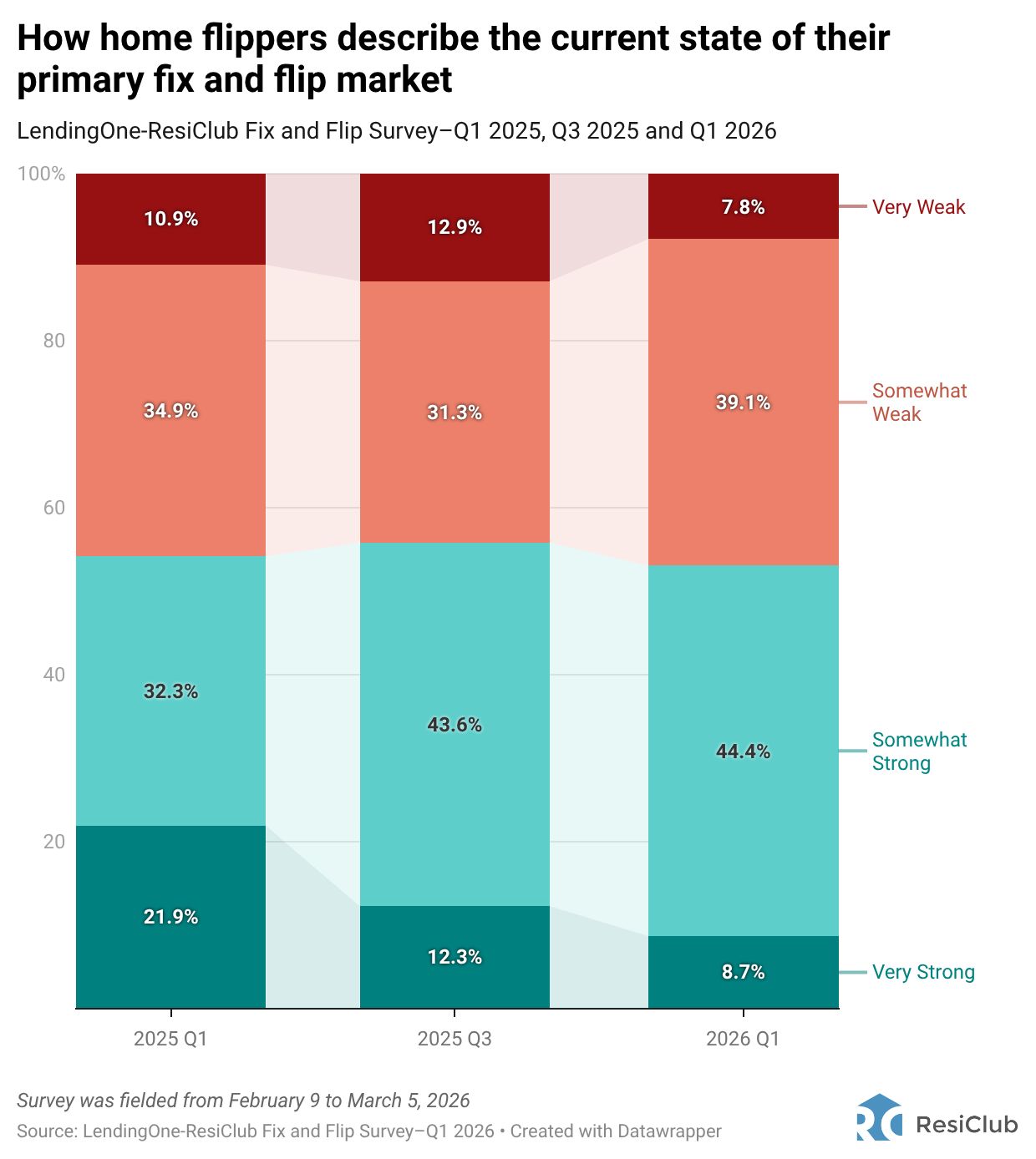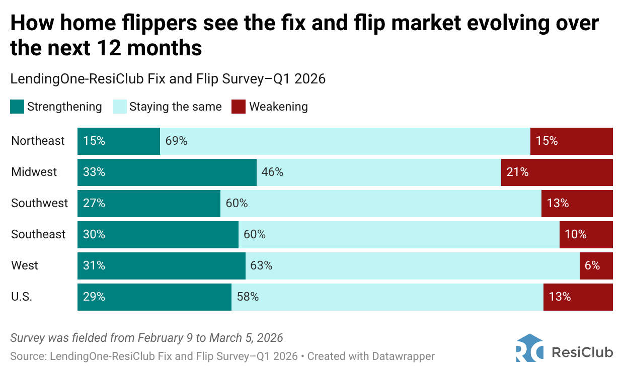 Market sentiment has remained steady over the last year: 53% of U.S. home flippers describe their primary market as somewhat strong (44%) or very strong (9%), compared to 56% in Q3 2025 and 54% in Q1 2025.
