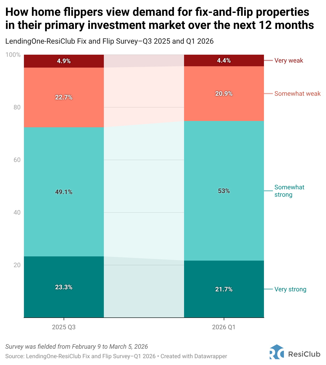Expectations for demand remain resilient: 75% of flippers expect somewhat strong (53%) or very strong (22%) demand over the next 12 months, compared to 72% in Q3 2025.
