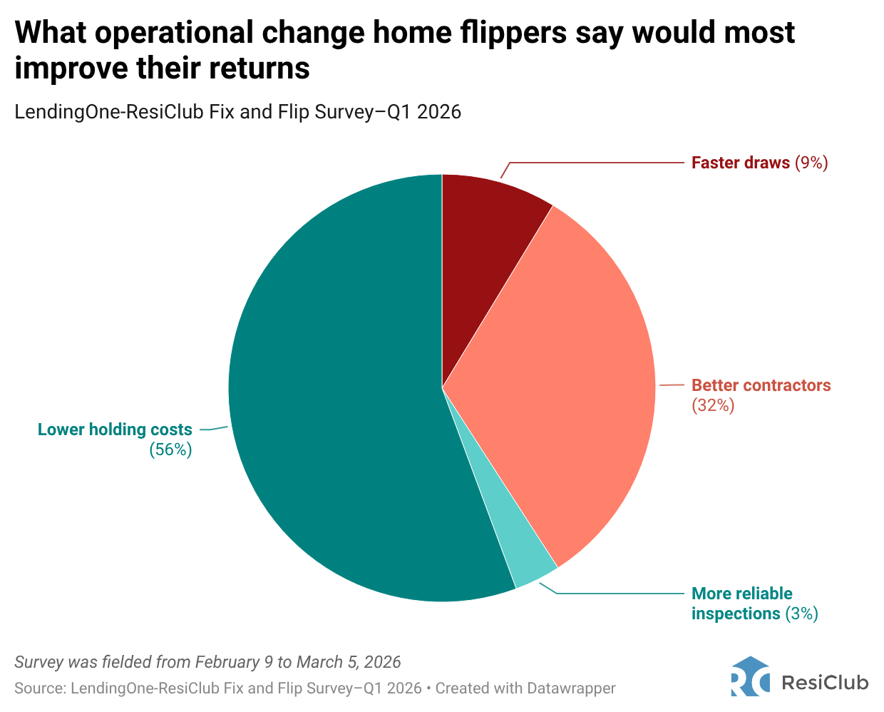 Lower holding costs would most improve returns according to 56% of flippers, followed by better contractors (32%), faster draws (9%), and more reliable inspections (3%).