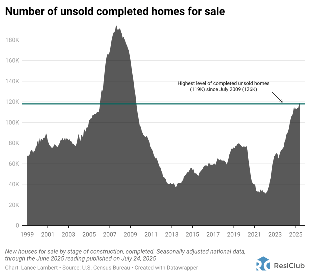 The June 2025 figure (119,000 unsold completed new homes) published last week is the highest level since July 2009 (126,000).