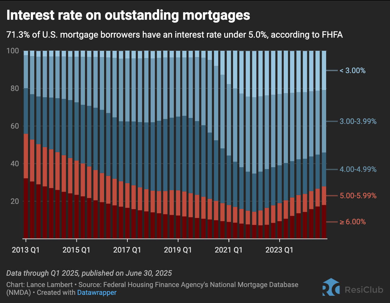 The reason? Among U.S. homeowners who have a mortgage, 71.3% have an interest rate below 5.0%—and 20.7% have a mortgage rate under 3.0%. Some homeowners won’t refi regardless of how far mortgage rates fall.