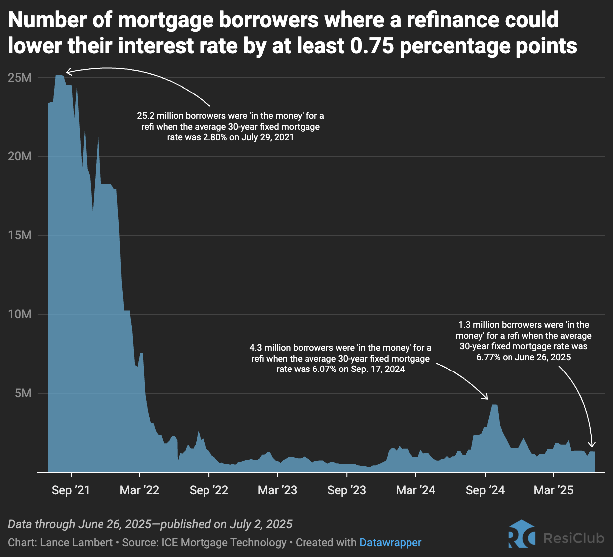 Heading into the fall last year, the average 30-year fixed mortgage rate slipped to a low of 6.07% by September 17, as the market reacted to weaker than expected labor market data. At that point, the number of mortgage borrowers “in the money” for a refinance opportunity, meaning a refinance would lower their interest rate by at least 0.75 percentage points, jumped to 4.3 million, according to ICE Mortgage Technology data provided to ResiClub.