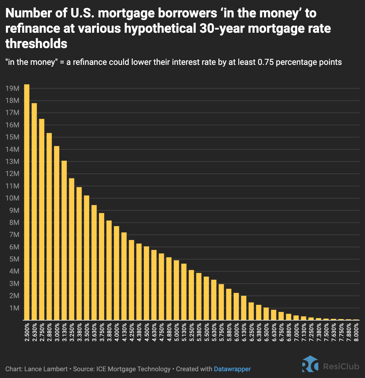 According to ICE Mortgage Technology, here’s how many U.S. mortgage borrowers would be “in the money” for a refinance opportunity at various hypothetical 30-year fixed mortgage rate thresholds:
