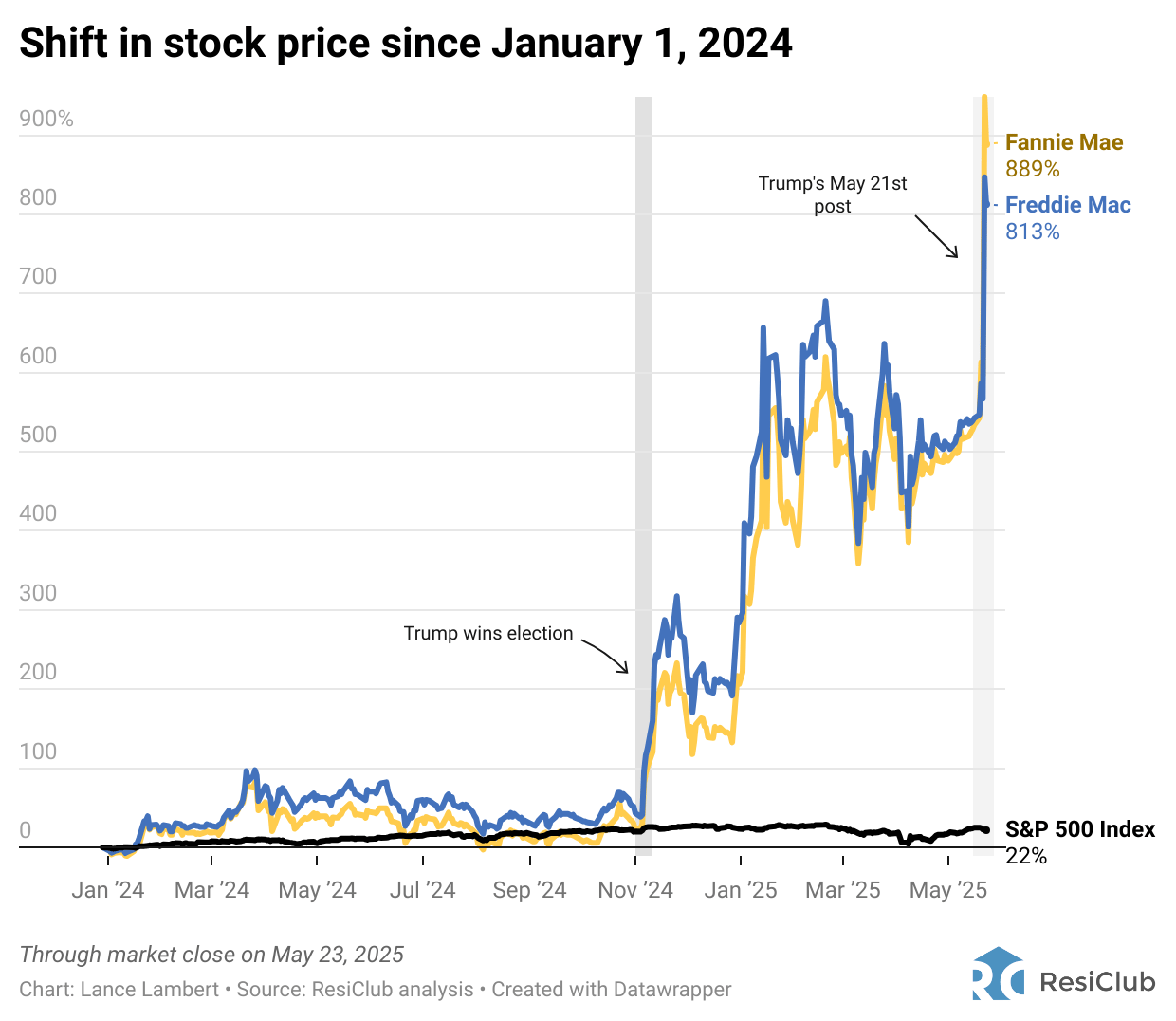 The odds of conservatorship ending—or at the very least, an attempt to unwind it—increased this week after Trump posted on social media: “I’m giving very serious consideration to bringing Fannie Mae and Freddie Mac public.” Then, on Thursday evening, Bill Pulte, the director of FHFA, tweeted out a podcast he did with Donald Trump Jr. centered on the future of Fannie Mae and Freddie Mac.