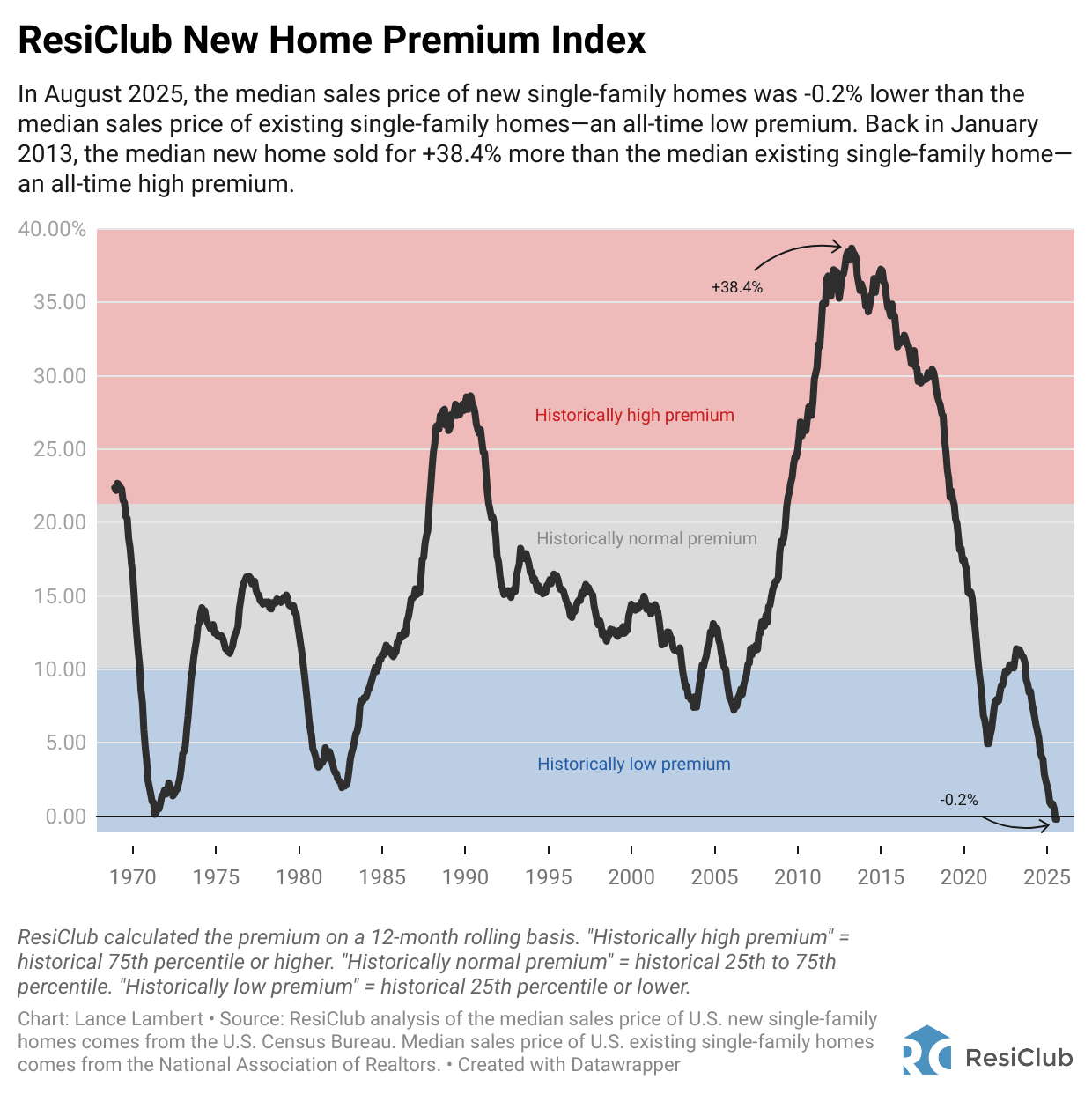 For the first time in modern housing market history, U.S. single-family new construction, in aggregate, is no longer selling at a premium to existing homes. According to the ResiClub New Home Premium Index, the median sales price of new single-family homes in August 2025 was -0.2% lower than the median sales price of existing single-family homes—an all-time low. That’s a dramatic shift from January 2013, when the typical new home sold for +38.4% more than a comparable existing home, marking the highest premium ever recorded.