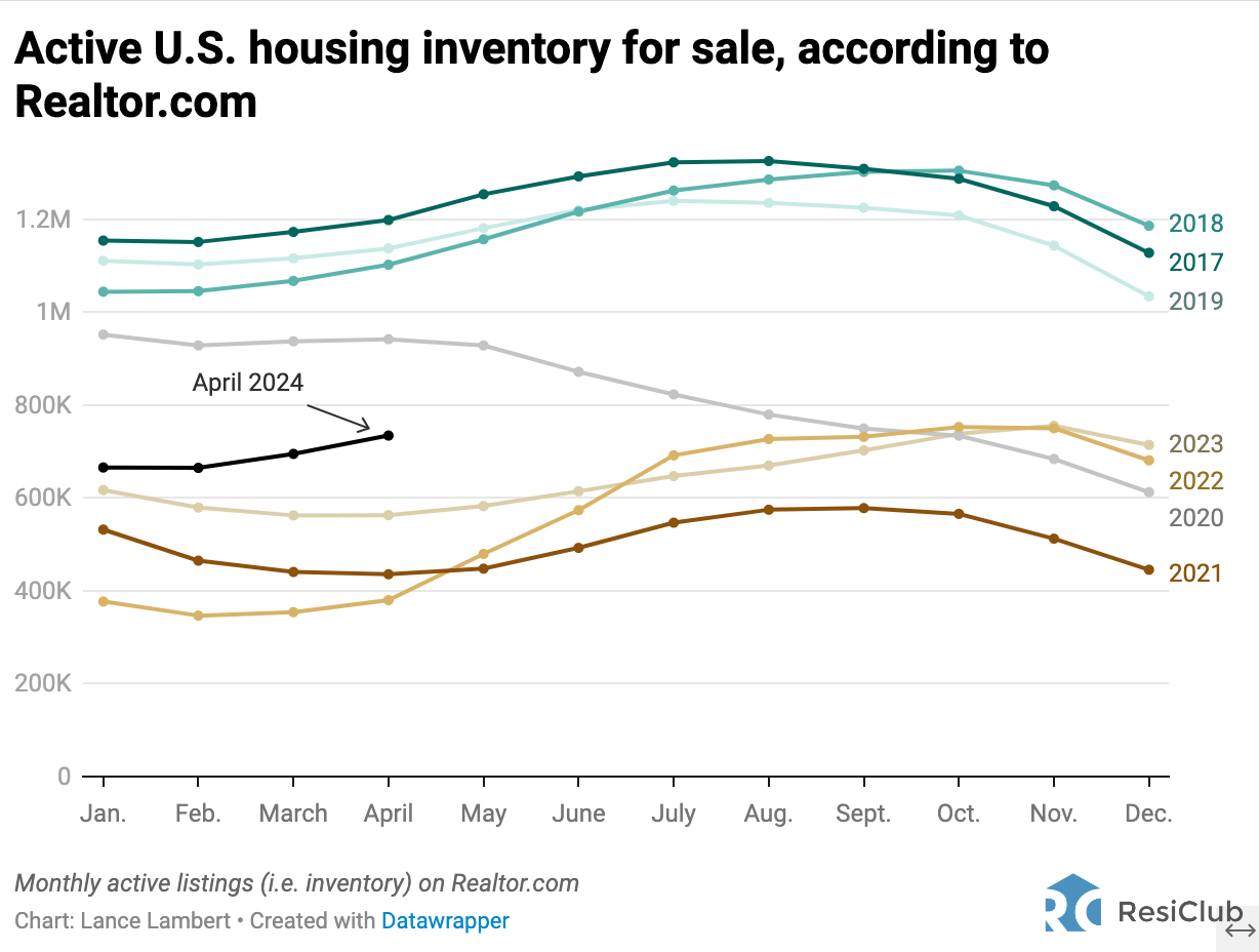 We are starting to see national active listings rise (+30% between April 2023 and April 2024); however, we’re still well below pre-pandemic levels (-35% below April 2019).*