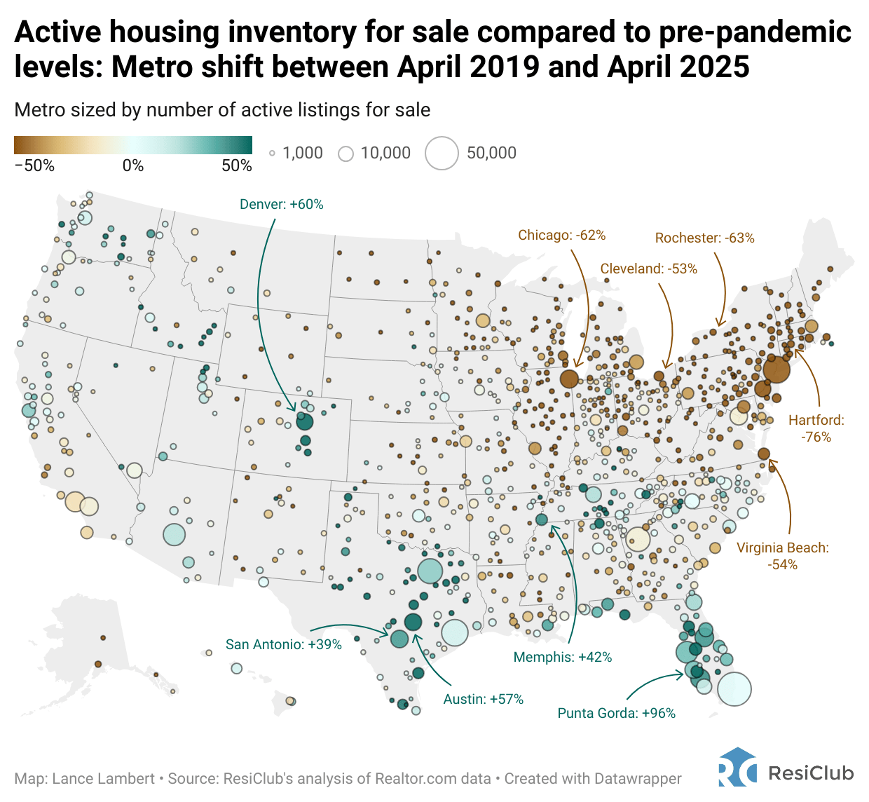 Now, at the end of April 2025, 69 of the 200 largest markets are above pre-pandemic 2019 inventory levels—and ResiClub expects that count will continue to rise this year.