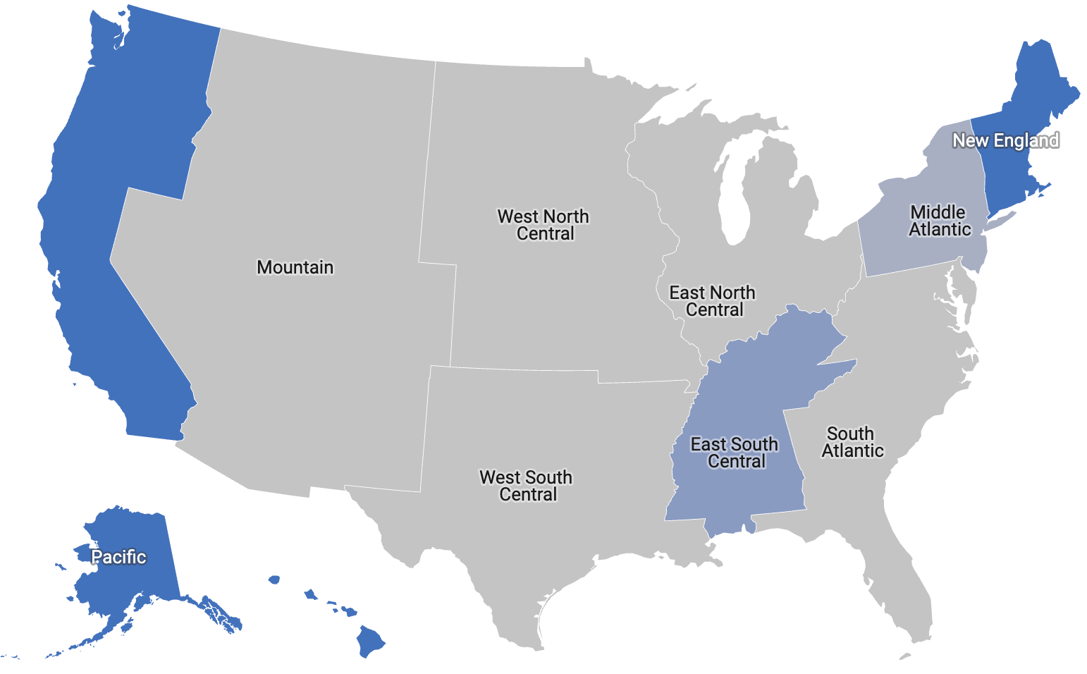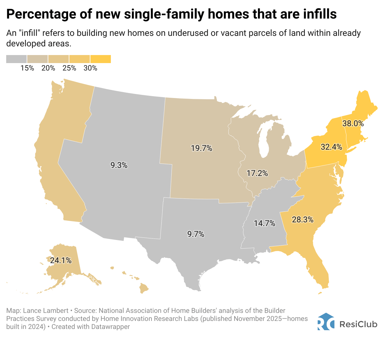 When you combine both categories, New England stands out: over half of its new single-family homes in 2024 were either infills or teardowns/rebuilds. The Middle Atlantic follows with similarly elevated shares, driven by infill activity exceeding 30% in states from New York to Pennsylvania. Meanwhile, in the Mountain West, West South Central, and parts of the South Atlantic, these redevelopment-driven forms of construction are much lower.